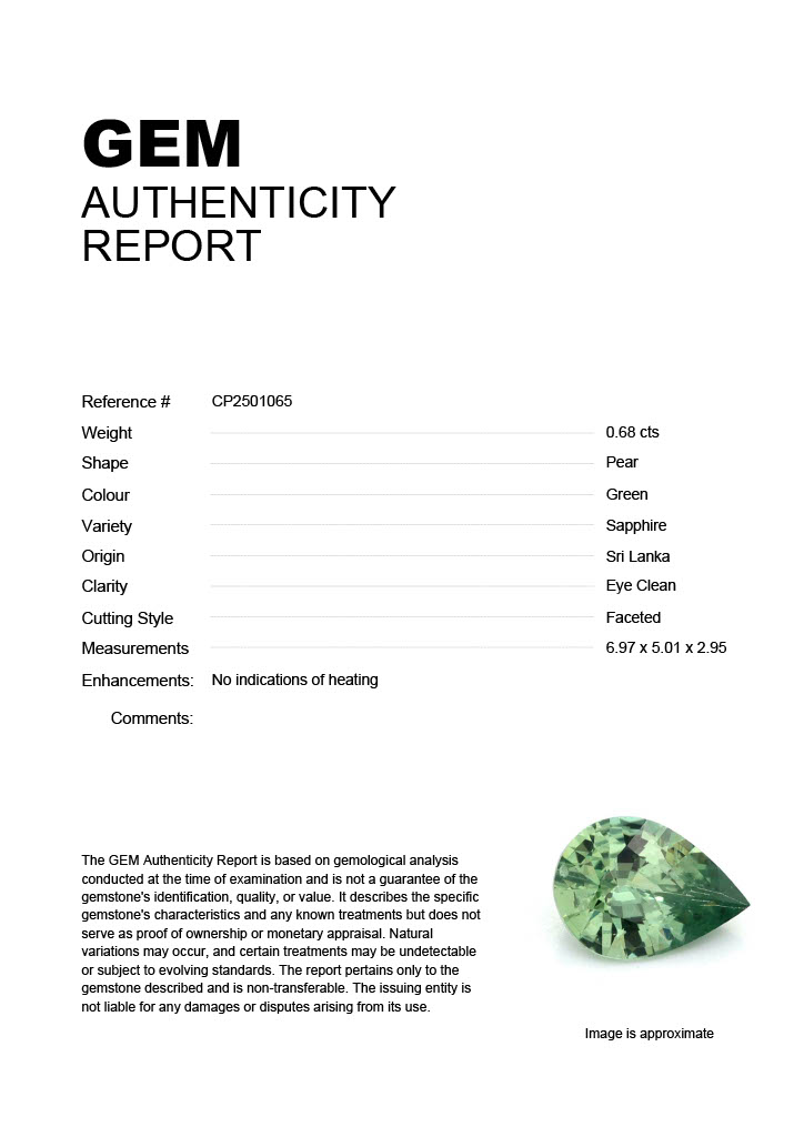 0.68ct Green Pear Sri Lanka SapphireCarat: 0.68 ctType: SapphireCut: PearColour: GreenOrigin: Sri LankaComment: Not Heated6.97 x 5.01 x 2.95 mm