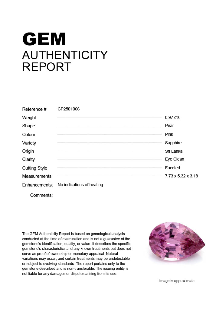 0.97ct Pink Pear Sri Lanka SapphireCarat: 0.97 ctType: SapphireCut: PearColour: PinkOrigin: Sri LankaComment: Not Heated7.73 x 5.32 x 3.18 mm