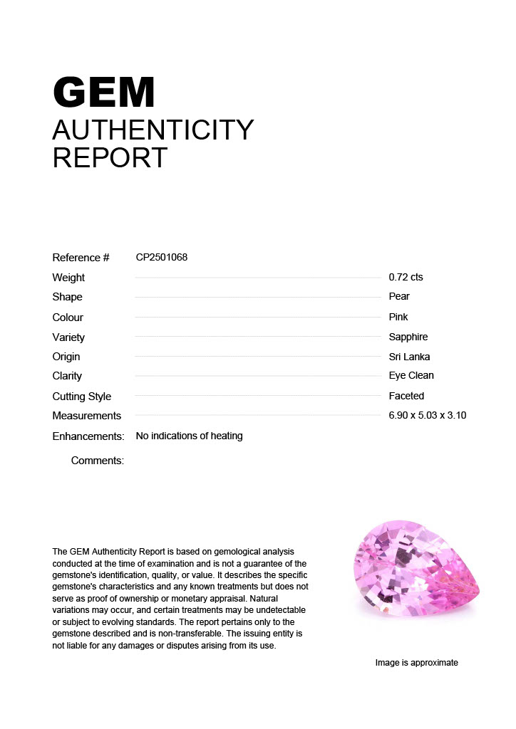 0.72ct Pink Pear Sri Lanka SapphireCarat: 0.72 ctType: SapphireCut: PearColour: PinkOrigin: Sri LankaComment: Not Heated6.90 x 5.03 x 3.10 mm