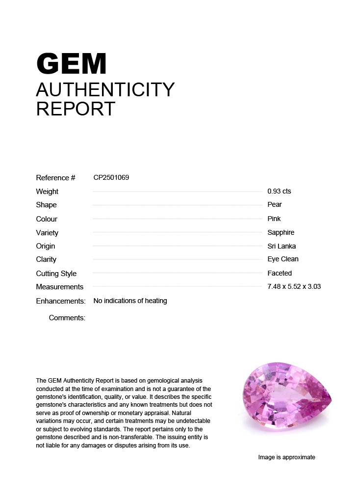 0.93ct Pink Pear Sri Lanka SapphireCarat: 0.93 ctType: SapphireCut: PearColour: PinkOrigin: Sri LankaComment: Not Heated7.48 x 5.52 x 3.03 mm