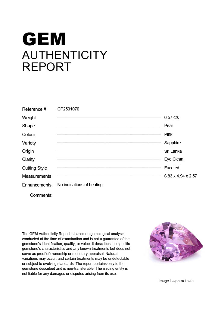 0.57ct Pink Pear Sri Lanka SapphireCarat: 0.57 ctType: SapphireCut: PearColour: PinkOrigin: Sri LankaComment: Not Heated6.83 x 4.94 x 2.57 mm