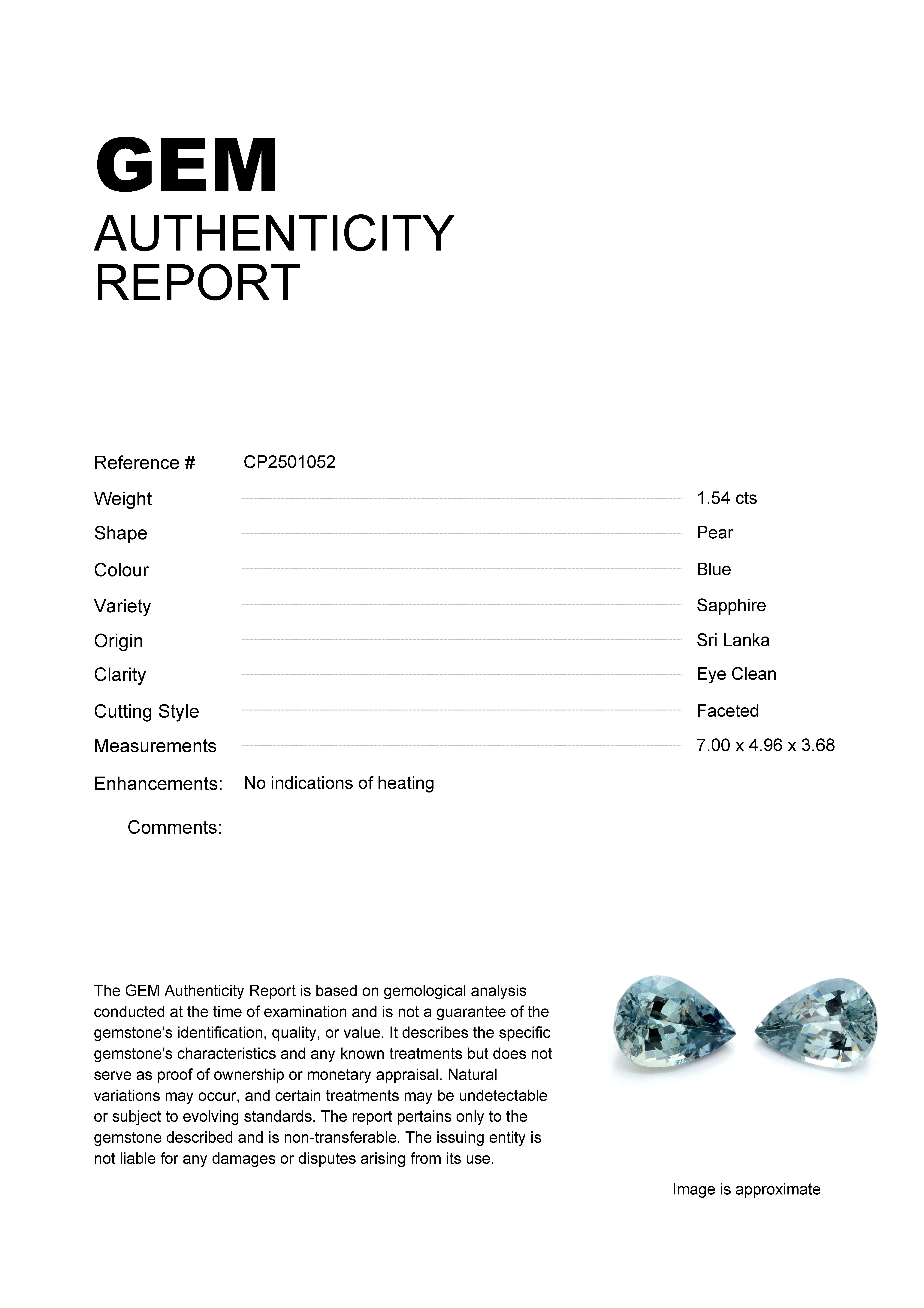 1.54ct Blue Pear Sri Lanka SapphireCarat: 1.54 ctType: SapphireCut: PearColour: BlueOrigin: Sri LankaComment: Not Heated7.00 x 4.96 x 3.68 mm