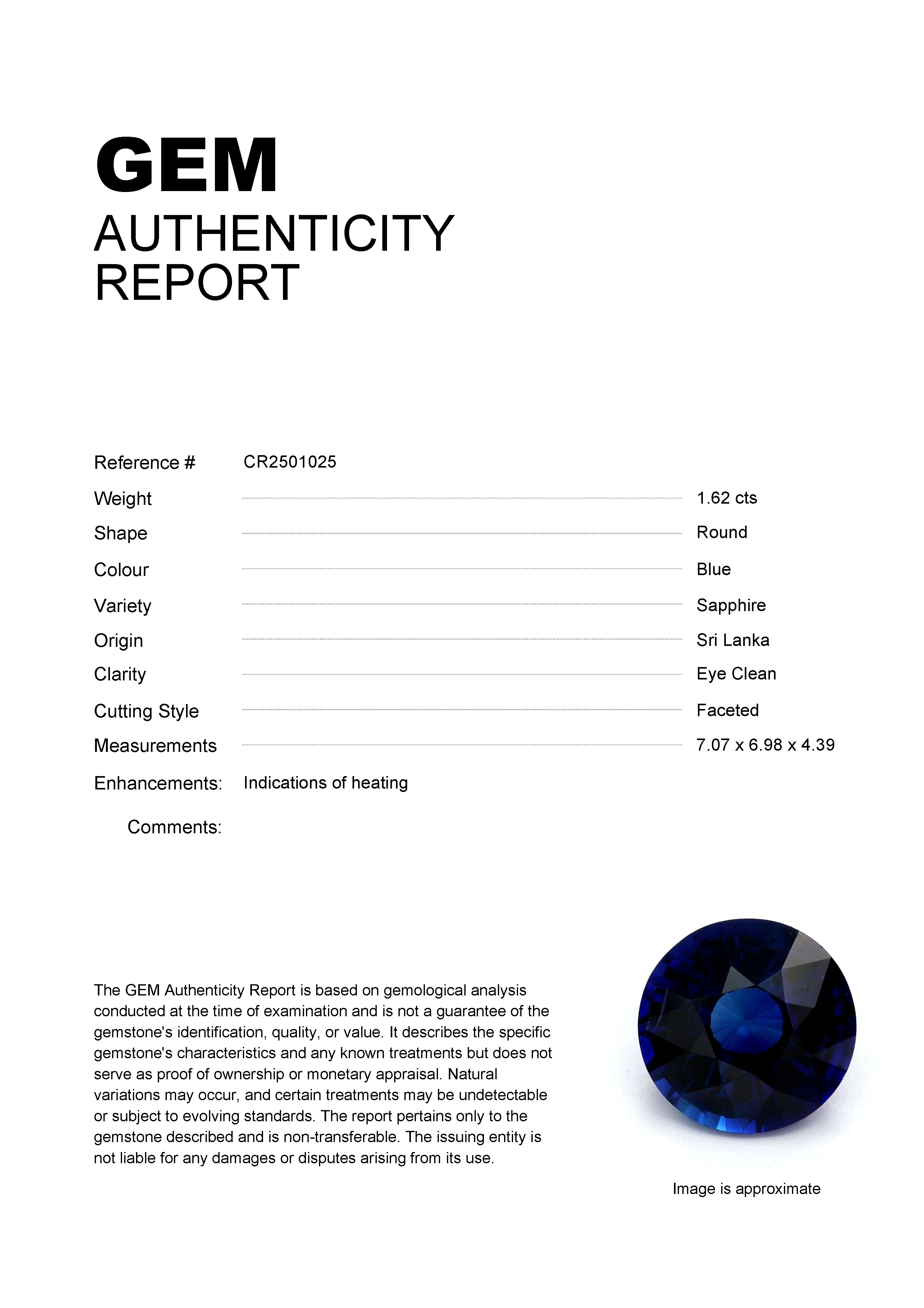1.62ct Blue Round Sri Lanka SapphireCarat: 1.62 ctType: SapphireCut: RoundColour: BlueOrigin: Sri LankaComment: Heated7.07 x 6.98 x 4.39 mm