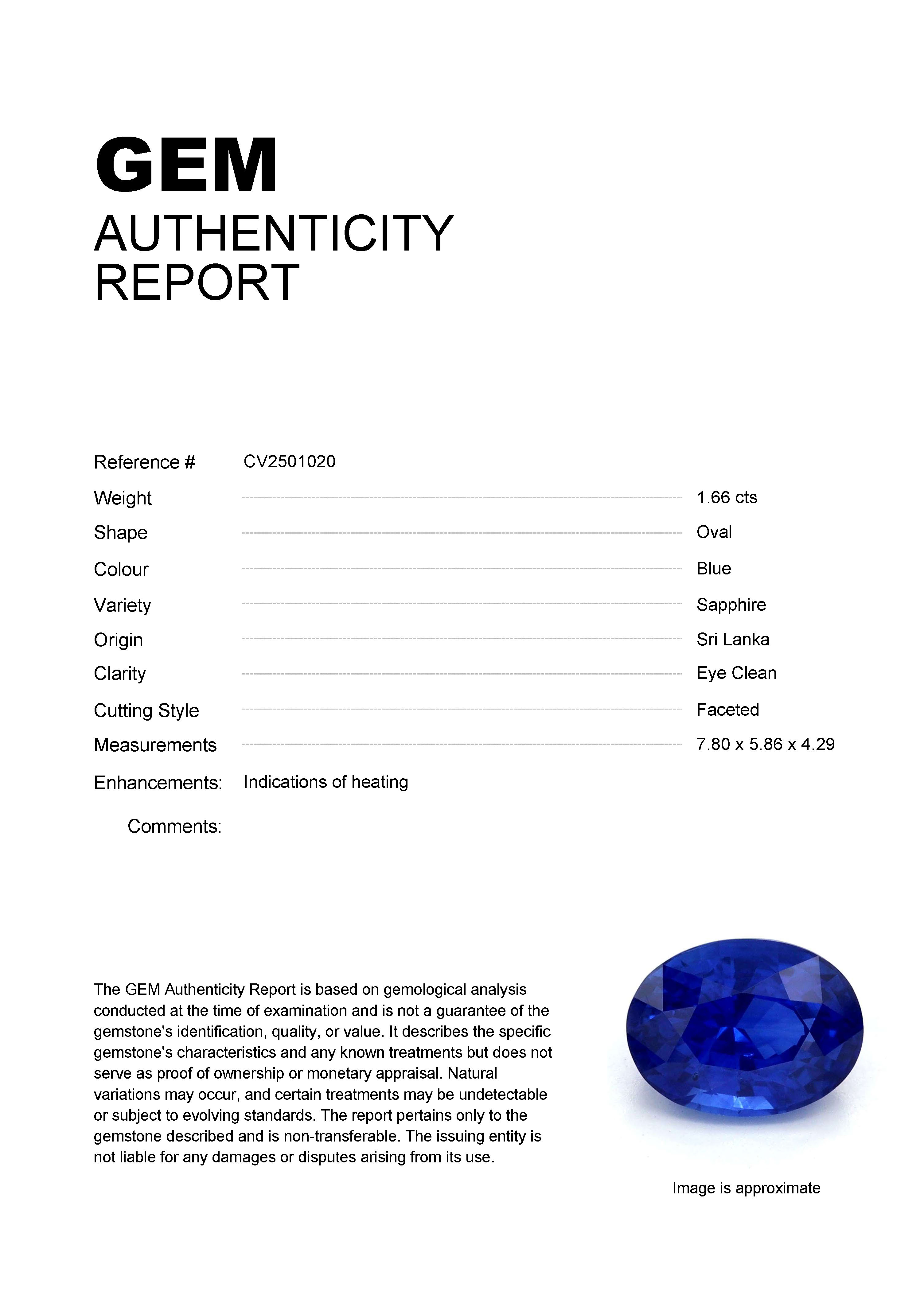 1.66ct Blue Oval Sri Lanka SapphireCarat: 1.66 ctType: SapphireCut: OvalColour: BlueOrigin: Sri LankaComment: Heated7.80 x 5.86 x 4.29 mm
