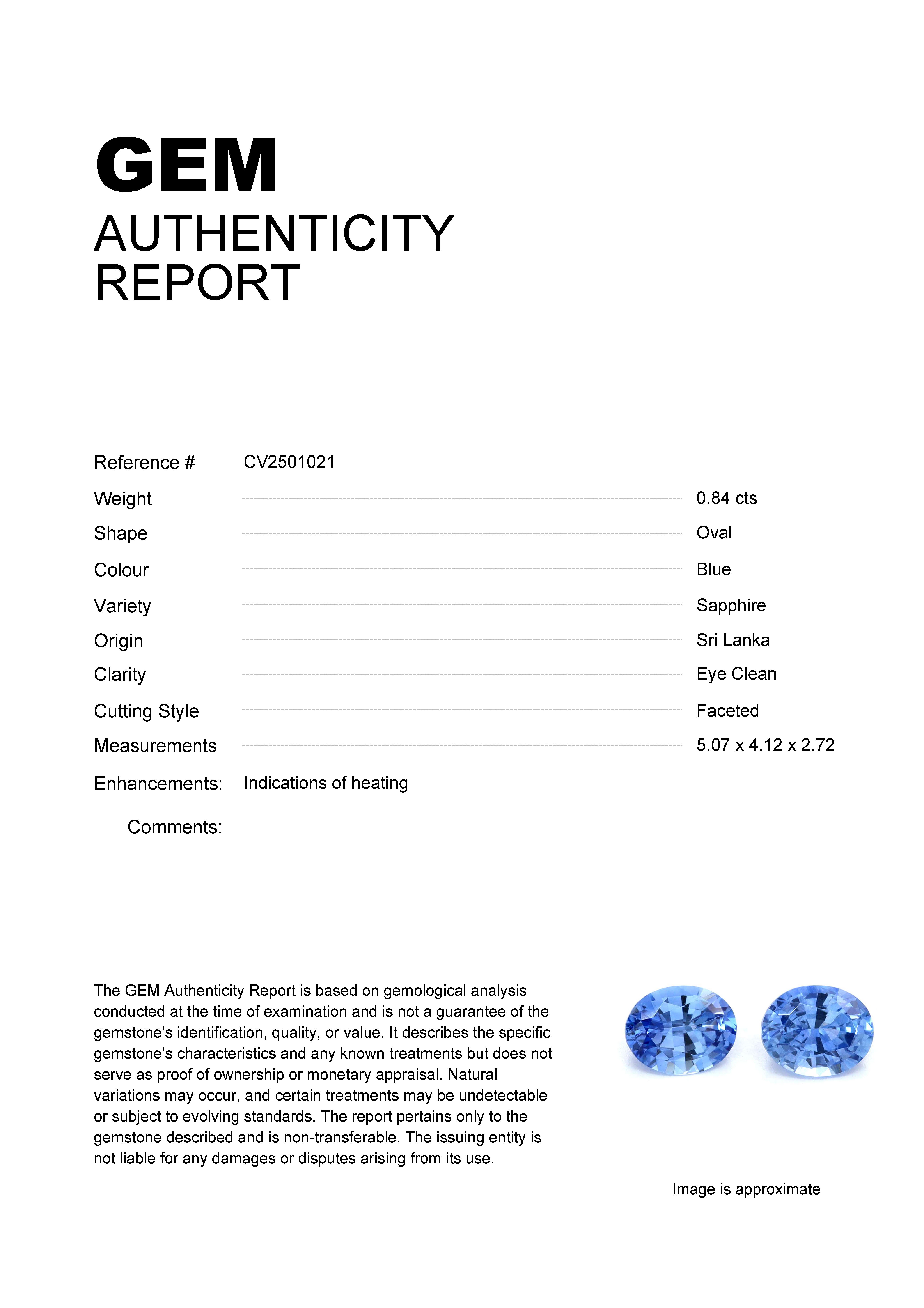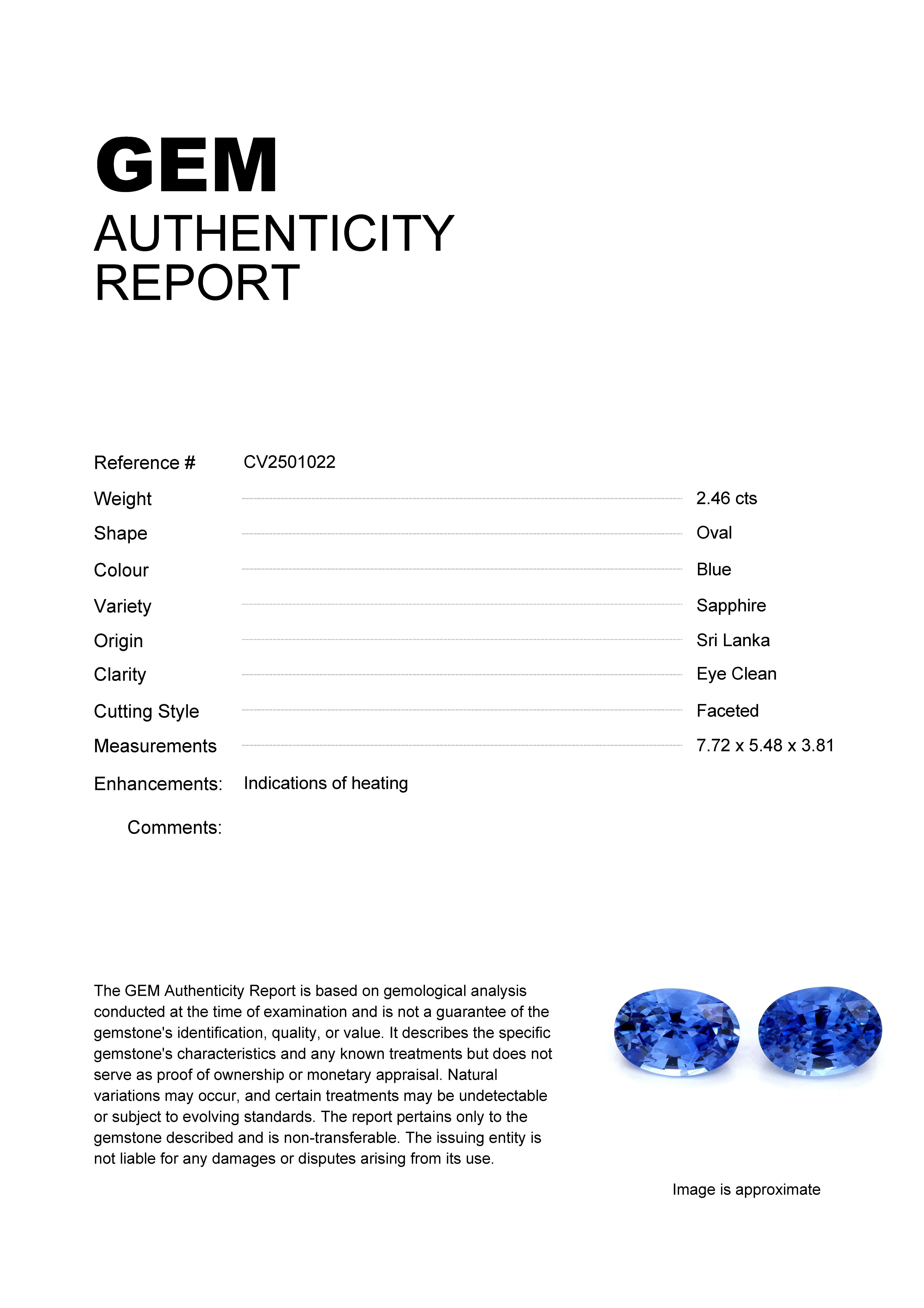 GEM: Matching Pair Stock ID: CV25010222.46ct Blue Oval Sri Lanka SapphireCarat: 2.46 ctType: SapphireCut: OvalColour: BlueOrigin: Sri LankaComment: Heated7.72 x 5.48 x 3.81 mm