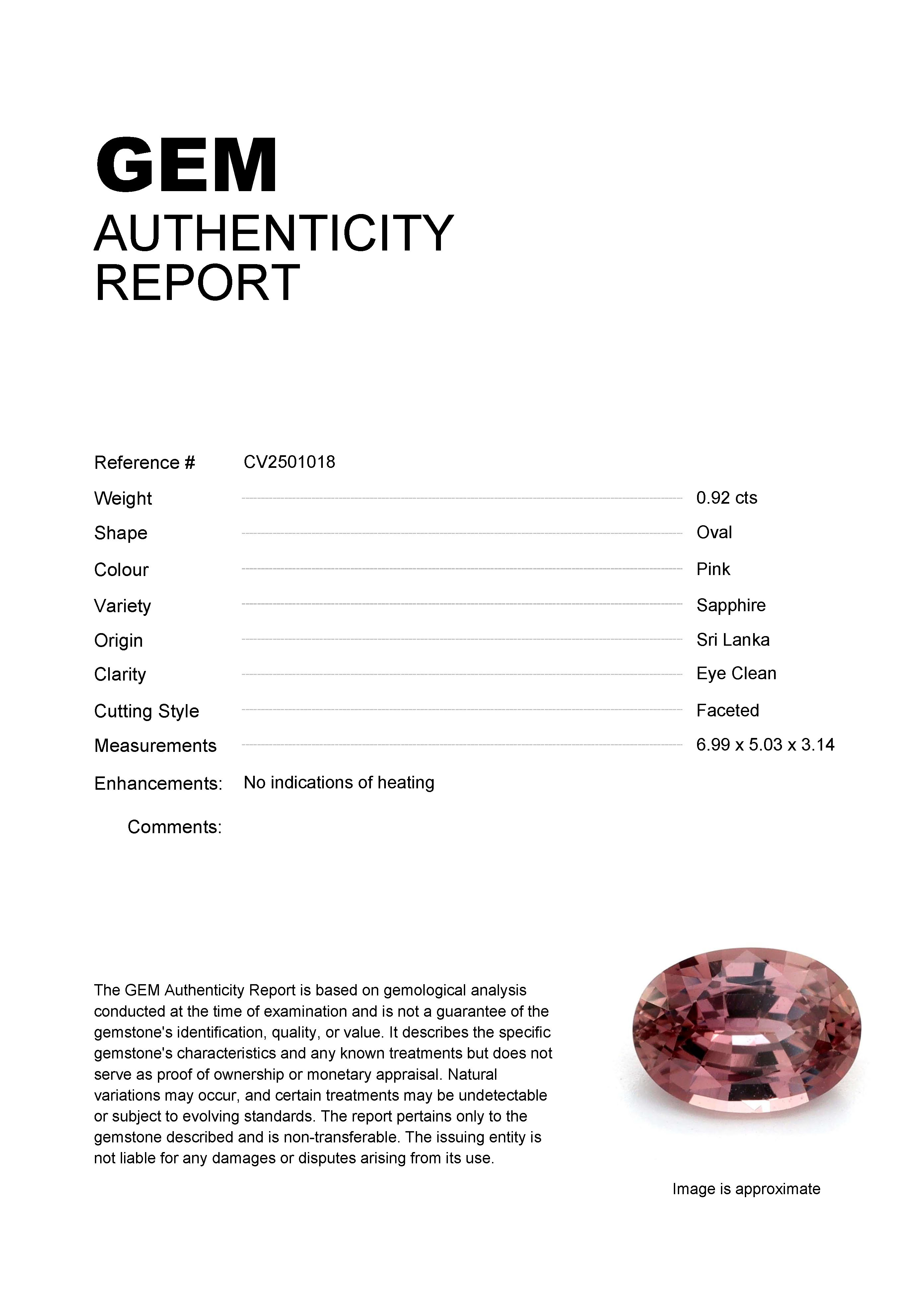 0.92ct Pink Oval Sri Lanka SapphireCarat: 0.92 ctType: SapphireCut: OvalColour: PinkOrigin: Sri LankaComment: Not Heated6.99 x 5.03 x 3.14 mm