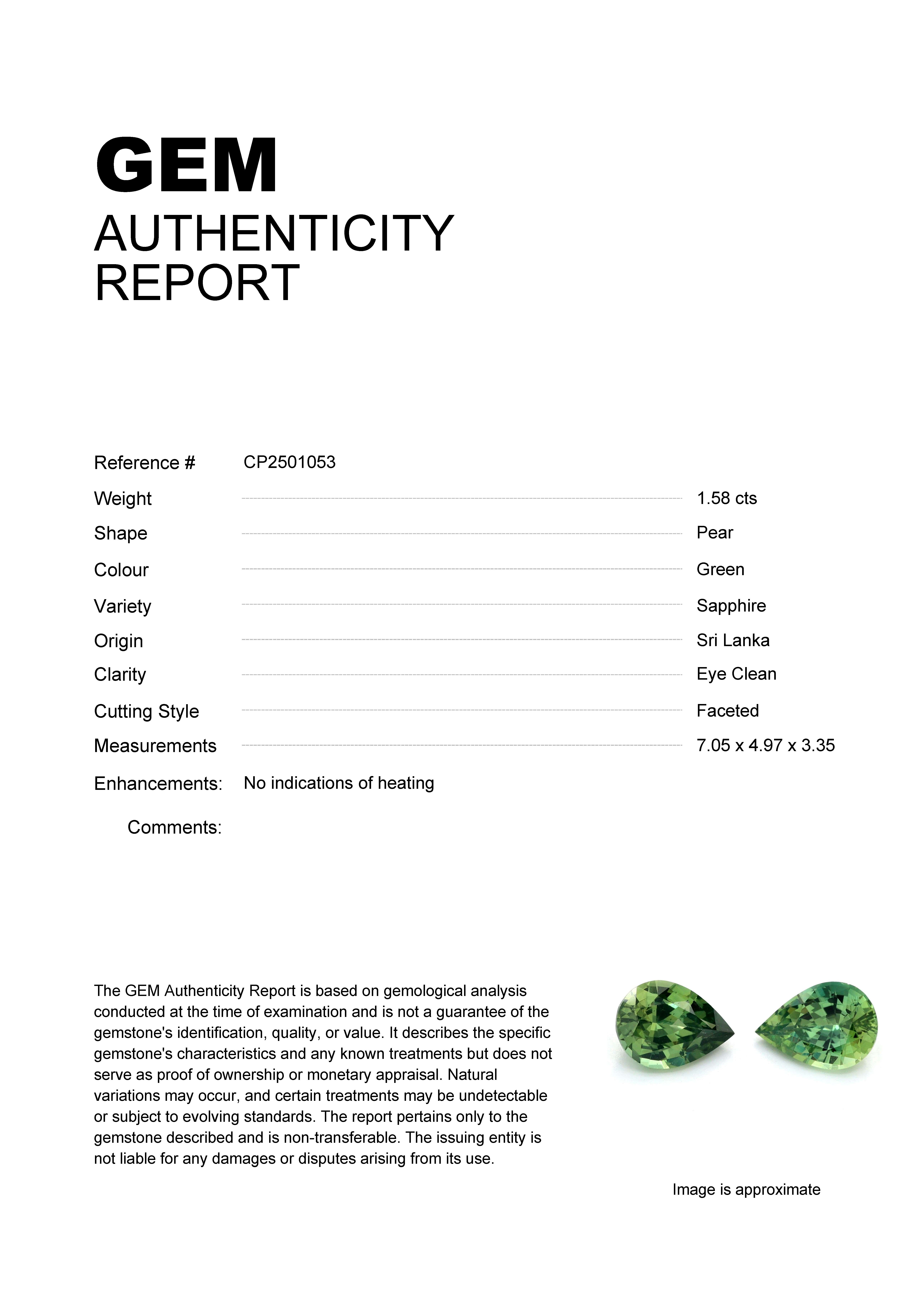 1.58ct Green Pear Sri Lanka SapphireCarat: 1.58 ctType: SapphireCut: PearColour: GreenOrigin: Sri LankaComment: Not Heated7.05 x 4.97 x 3.35 mm