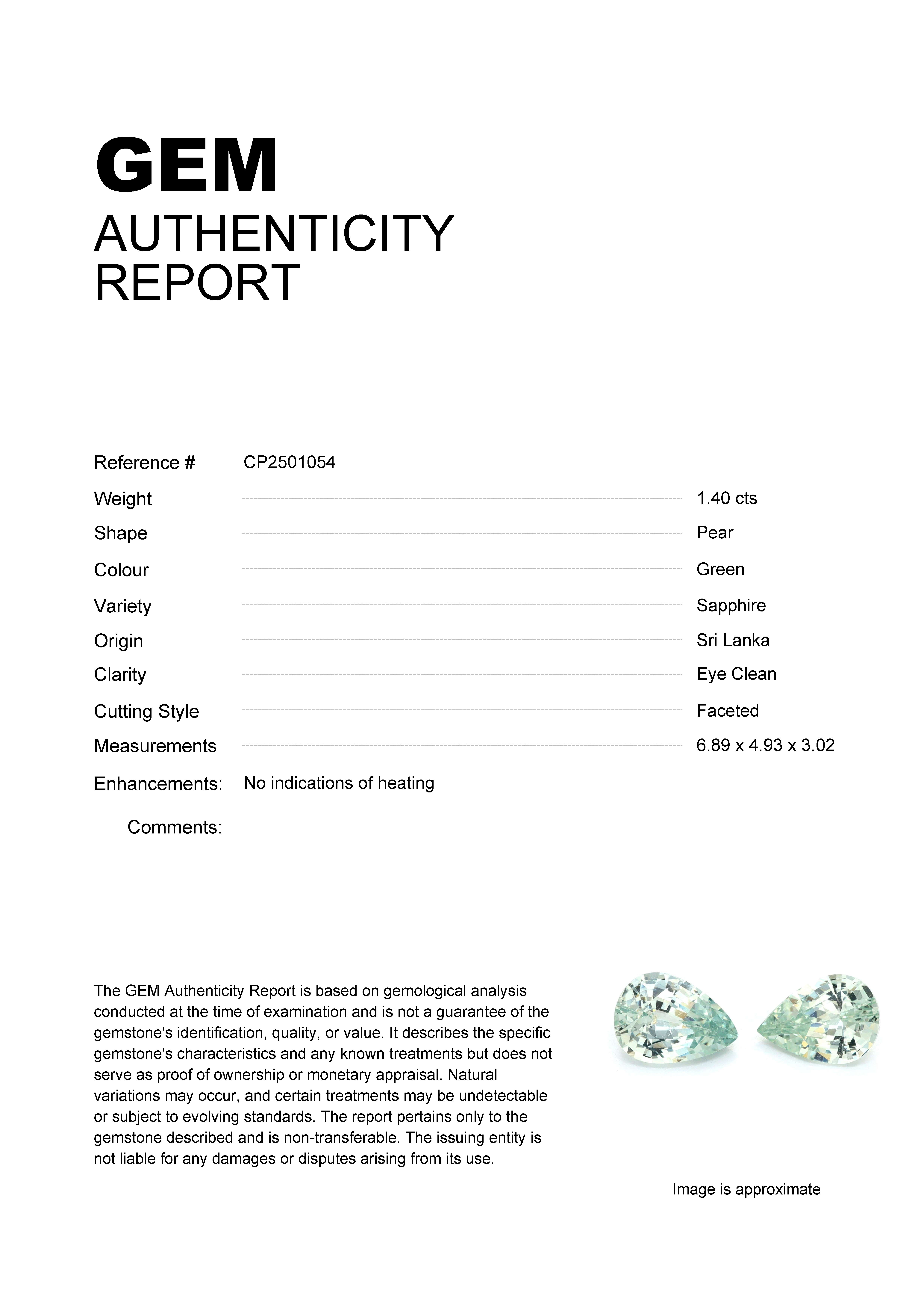 1.40ct Green Pear Sri Lanka SapphireCarat: 1.40 ctType: SapphireCut: PearColour: GreenOrigin: Sri LankaComment: Not Heated6.89 x 4.93 x 3.02 mm