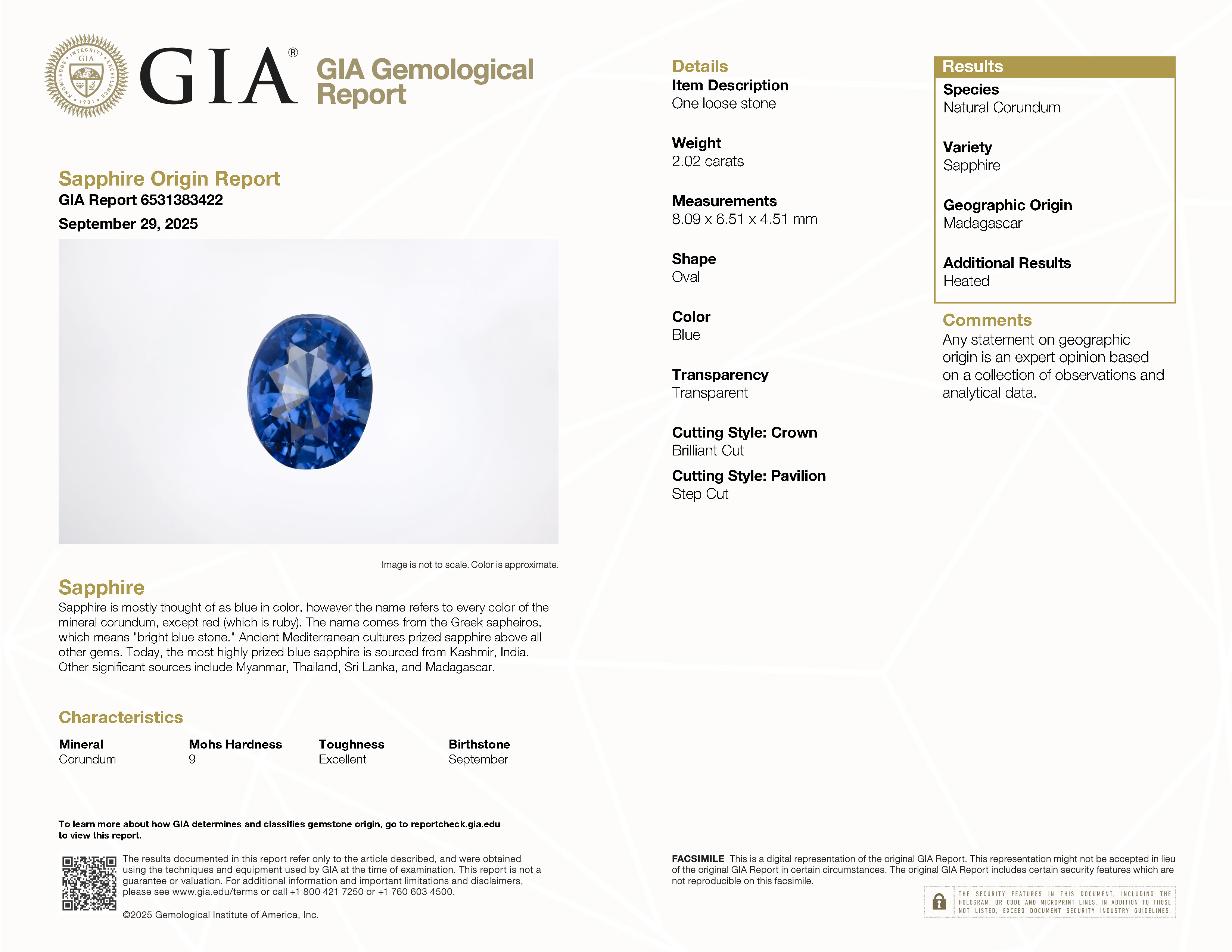 GIA: 6531383422 Stock ID: MSV24060292.02ct Blue Oval Madagascar SapphireCarat: 2.02 ctType: SapphireCut: OvalColour: BlueOrigin: MadagascarComment: Heated8.09 x 6.51 x 4.51 mm