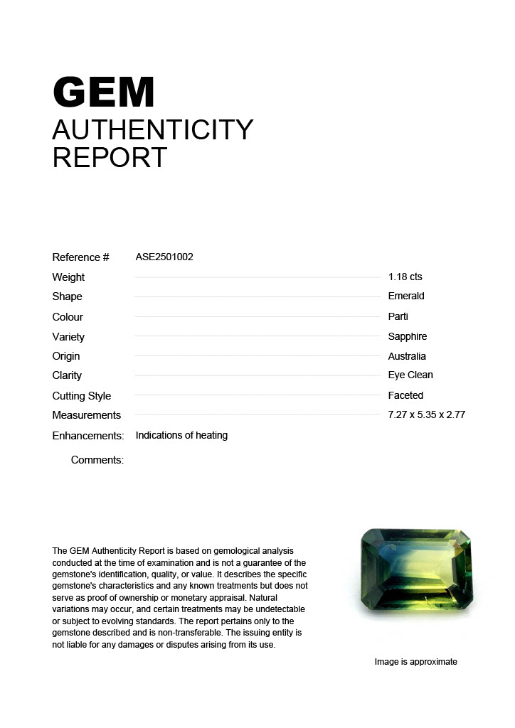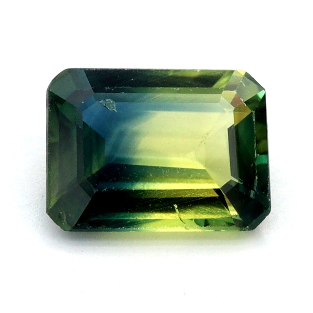 GEM: Stock ID: ASE25010021.18ct Parti Emerald Australia SapphireCarat: 1.18 ctType: SapphireCut: EmeraldColour: PartiOrigin: AustraliaComment: Heated7.27 x 5.35 x 2.77 mm