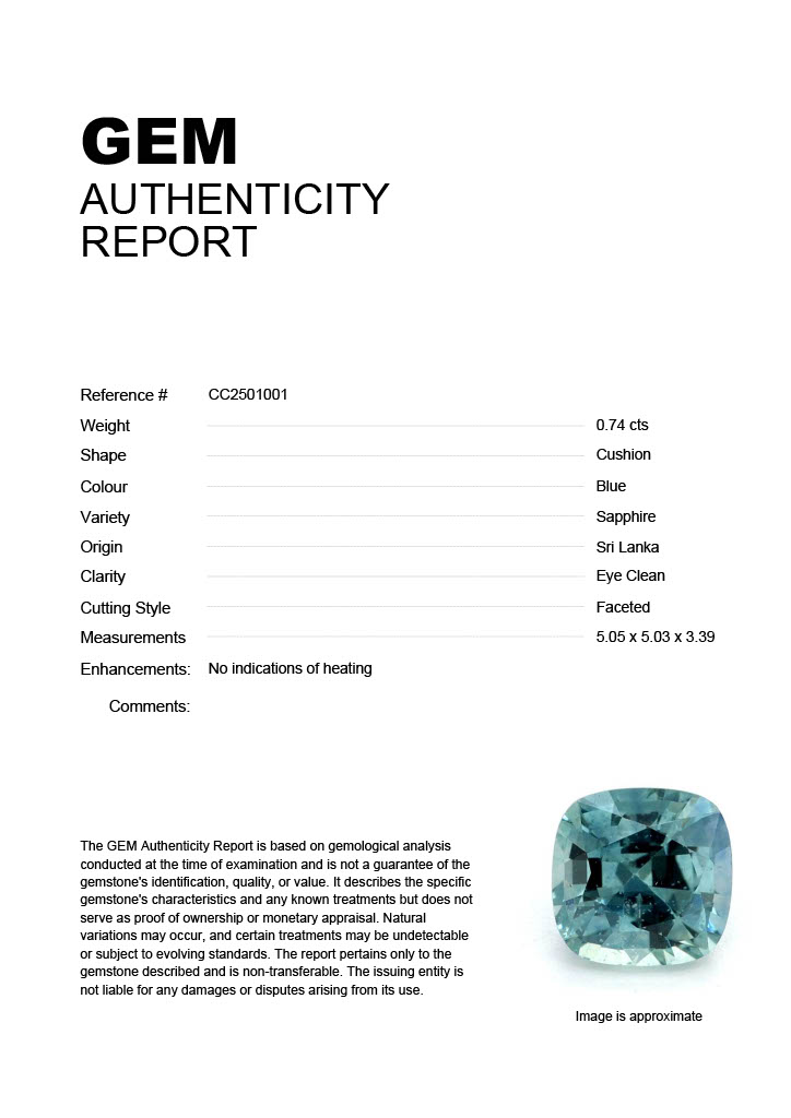 0.74ct Blue Cushion Sri Lanka SapphireCarat: 0.74 ctType: SapphireCut: CushionColour: BlueOrigin: Sri LankaComment: Not Heated5.05 x 5.03 x 3.39 mm