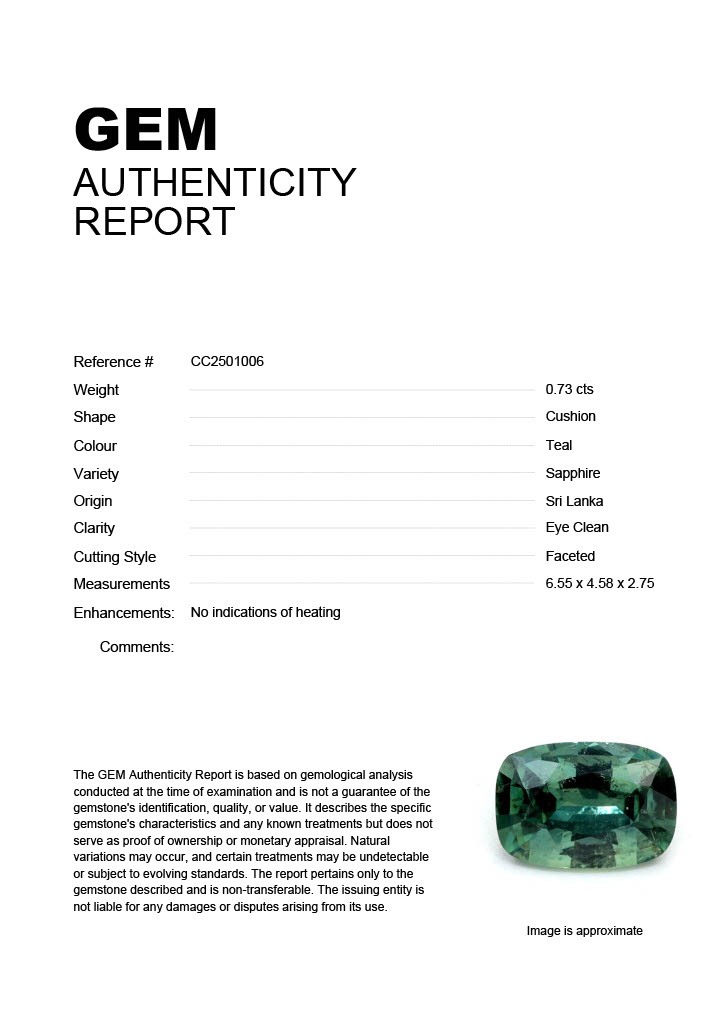 0.73ct Teal Cushion Sri Lanka SapphireCarat: 0.73 ctType: SapphireCut: CushionColour: TealOrigin: Sri LankaComment: Not Heated6.55 x 4.58 x 2.75 mm