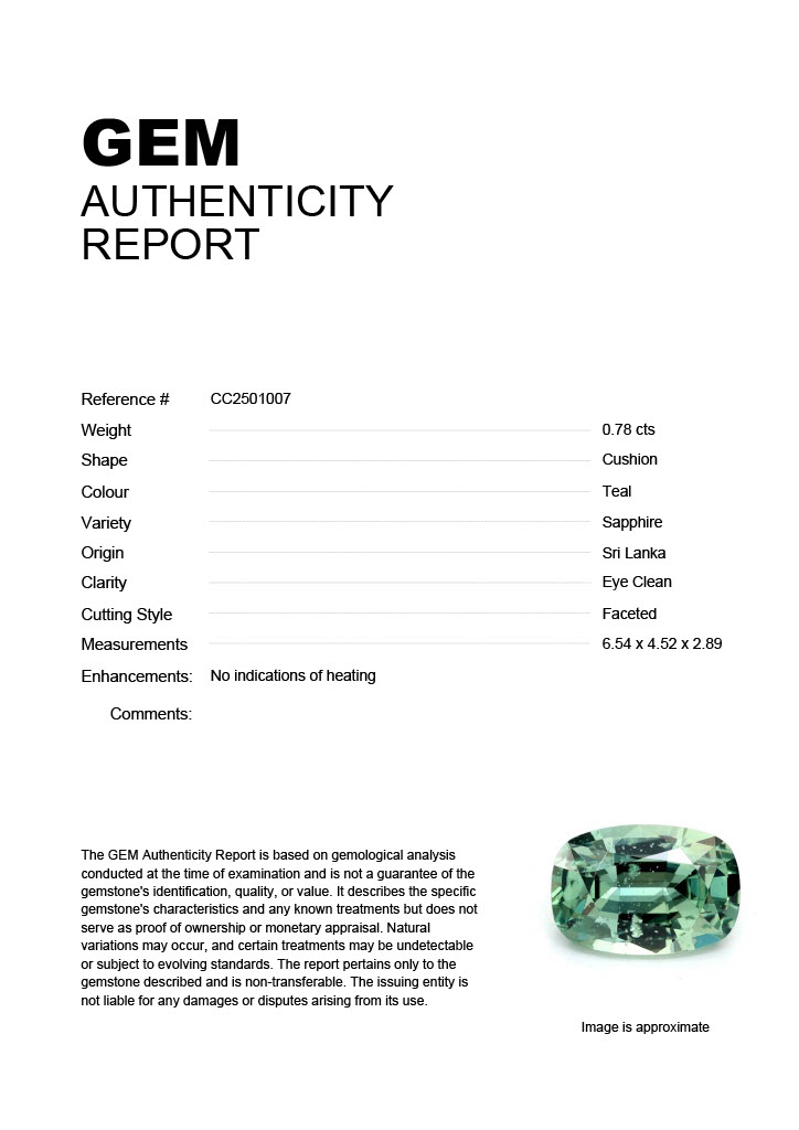 0.78ct Teal Cushion Sri Lanka SapphireCarat: 0.78 ctType: SapphireCut: CushionColour: TealOrigin: Sri LankaComment: Not Heated6.54 x 4.52 x 2.89 mm