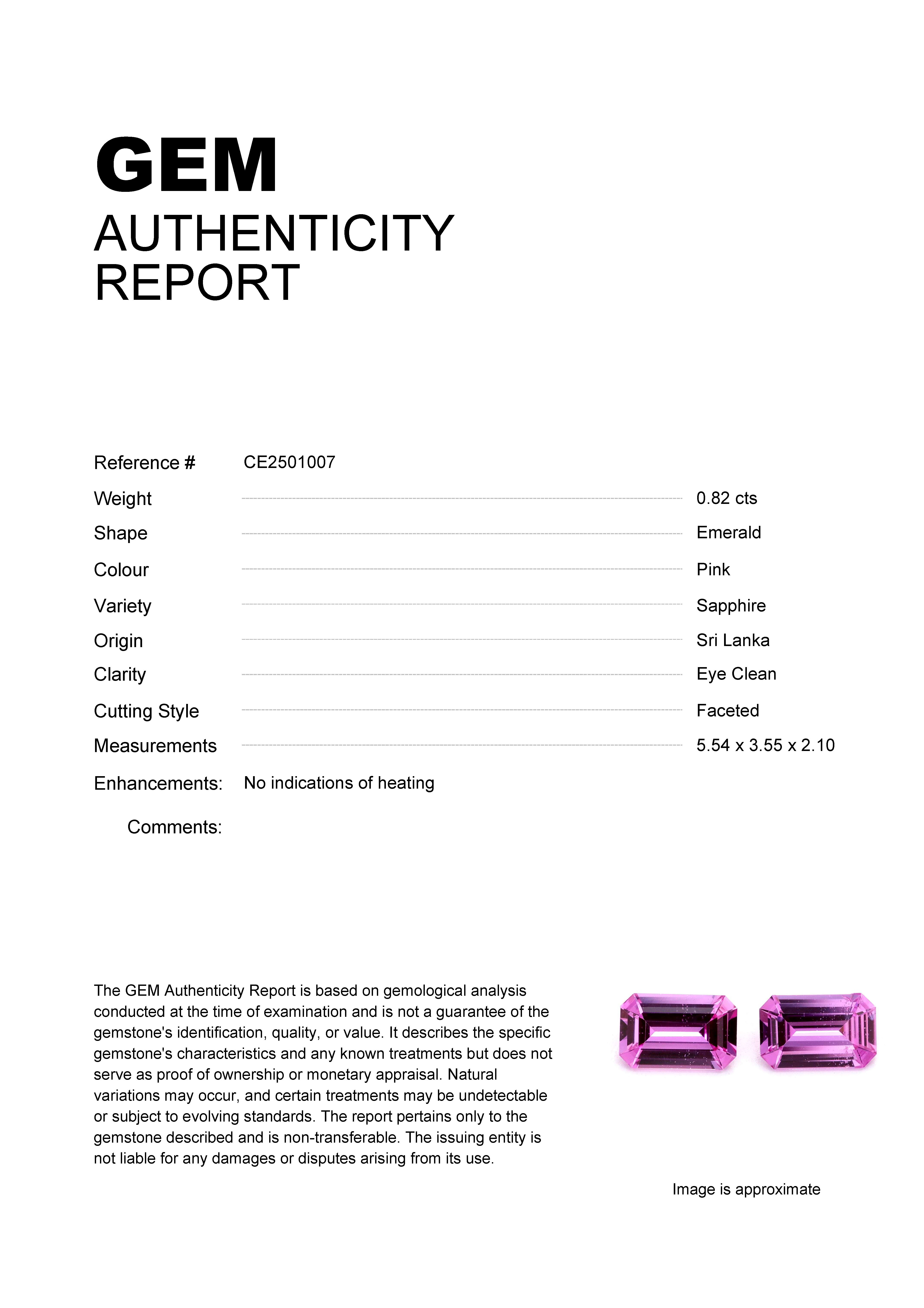 0.82ct Pink Emerald Sri Lanka SapphireCarat: 0.82 ctType: SapphireCut: EmeraldColour: PinkOrigin: Sri LankaComment: Not Heated5.54 x 3.55 x 2.10 mm