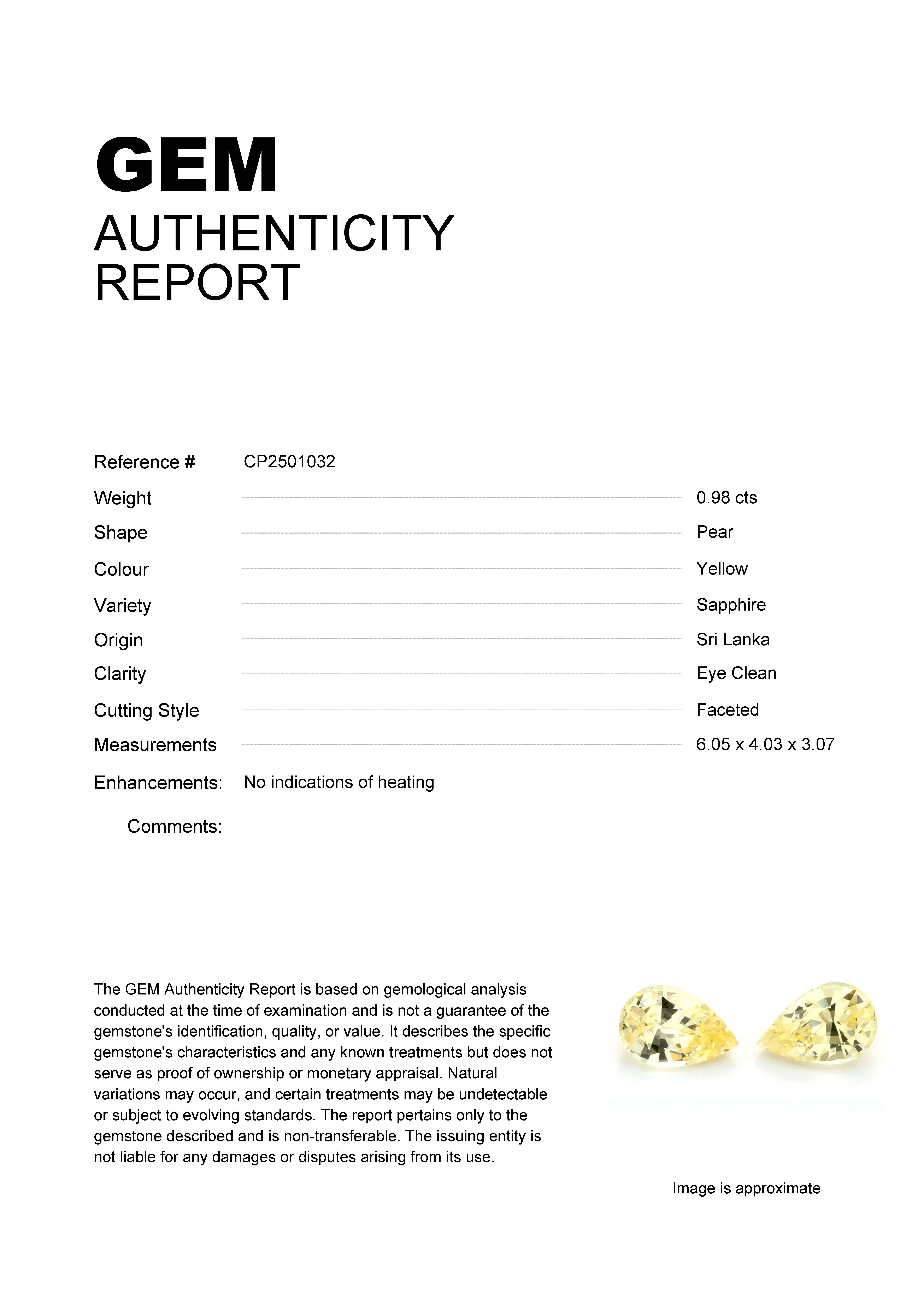 0.98ct Yellow Pear Sri Lanka SapphireCarat: 0.98 ctType: SapphireCut: PearColour: YellowOrigin: Sri LankaComment: Not Heated6.05 x 4.03 x 3.07 mm