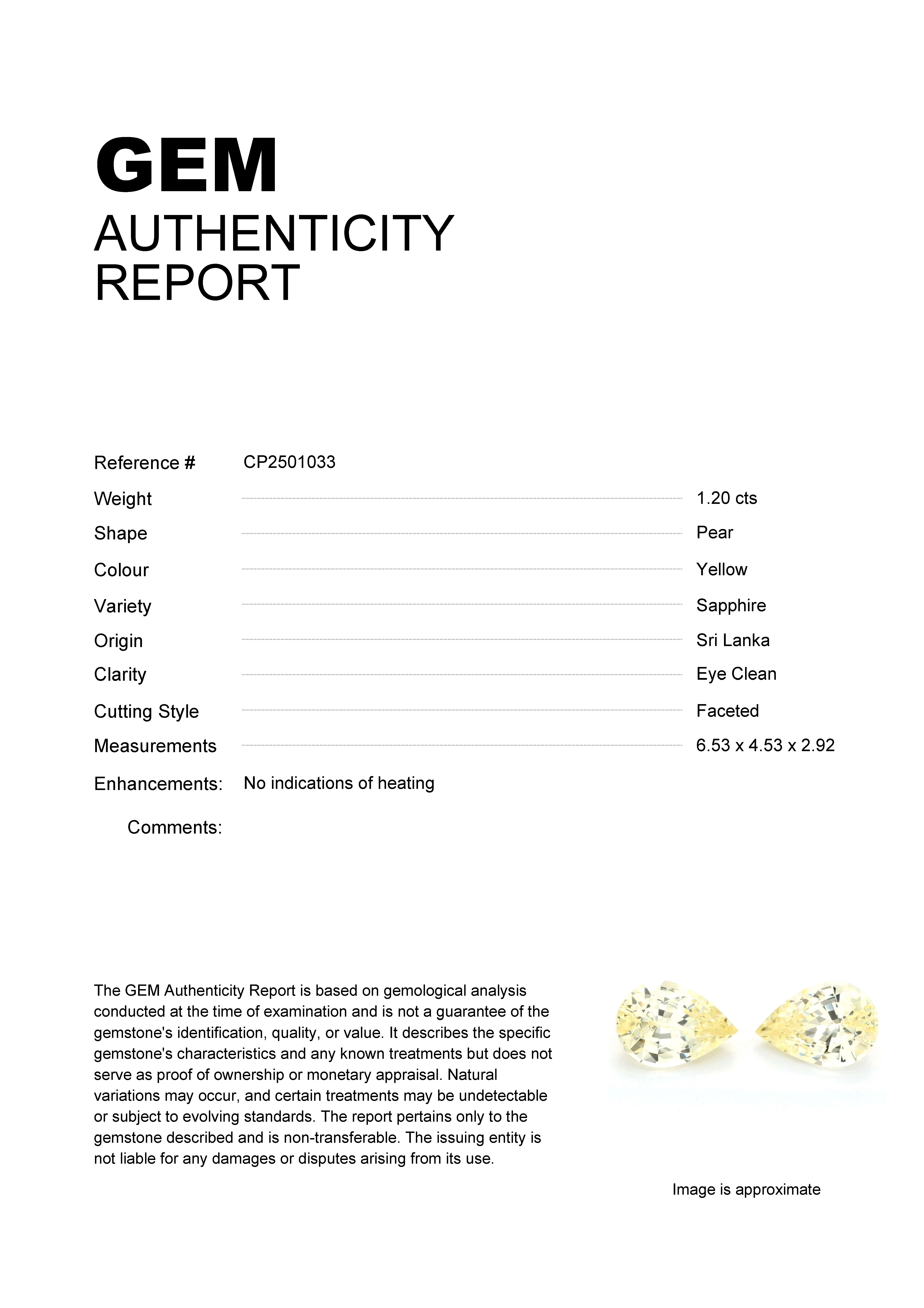 1.20ct Yellow Pear Sri Lanka SapphireCarat: 1.20 ctType: SapphireCut: PearColour: YellowOrigin: Sri LankaComment: Not Heated6.53 x 4.53 x 2.92 mm
