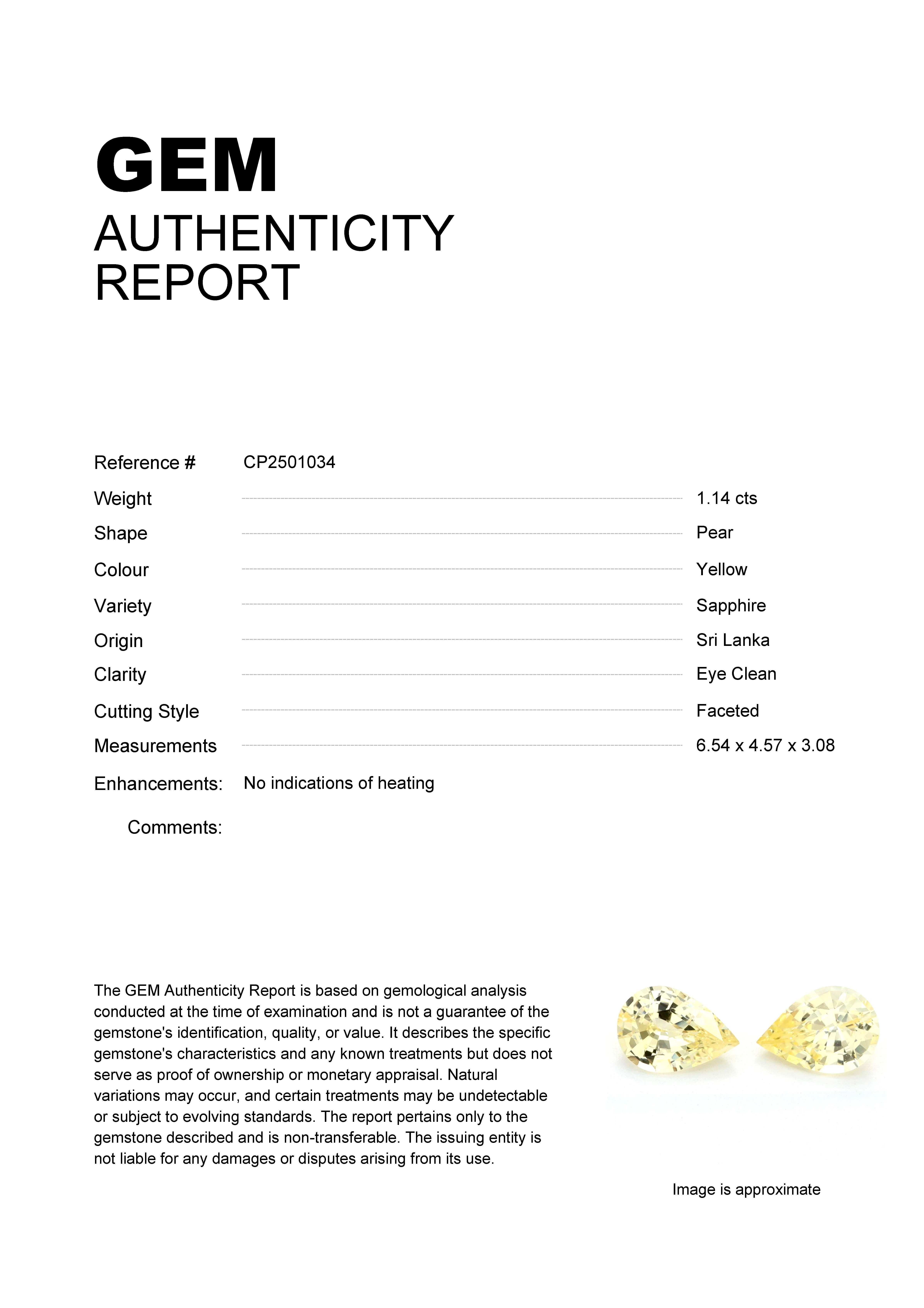 1.14ct Yellow Pear Sri Lanka SapphireCarat: 1.14 ctType: SapphireCut: PearColour: YellowOrigin: Sri LankaComment: Not Heated6.54 x 4.57 x 3.08 mm