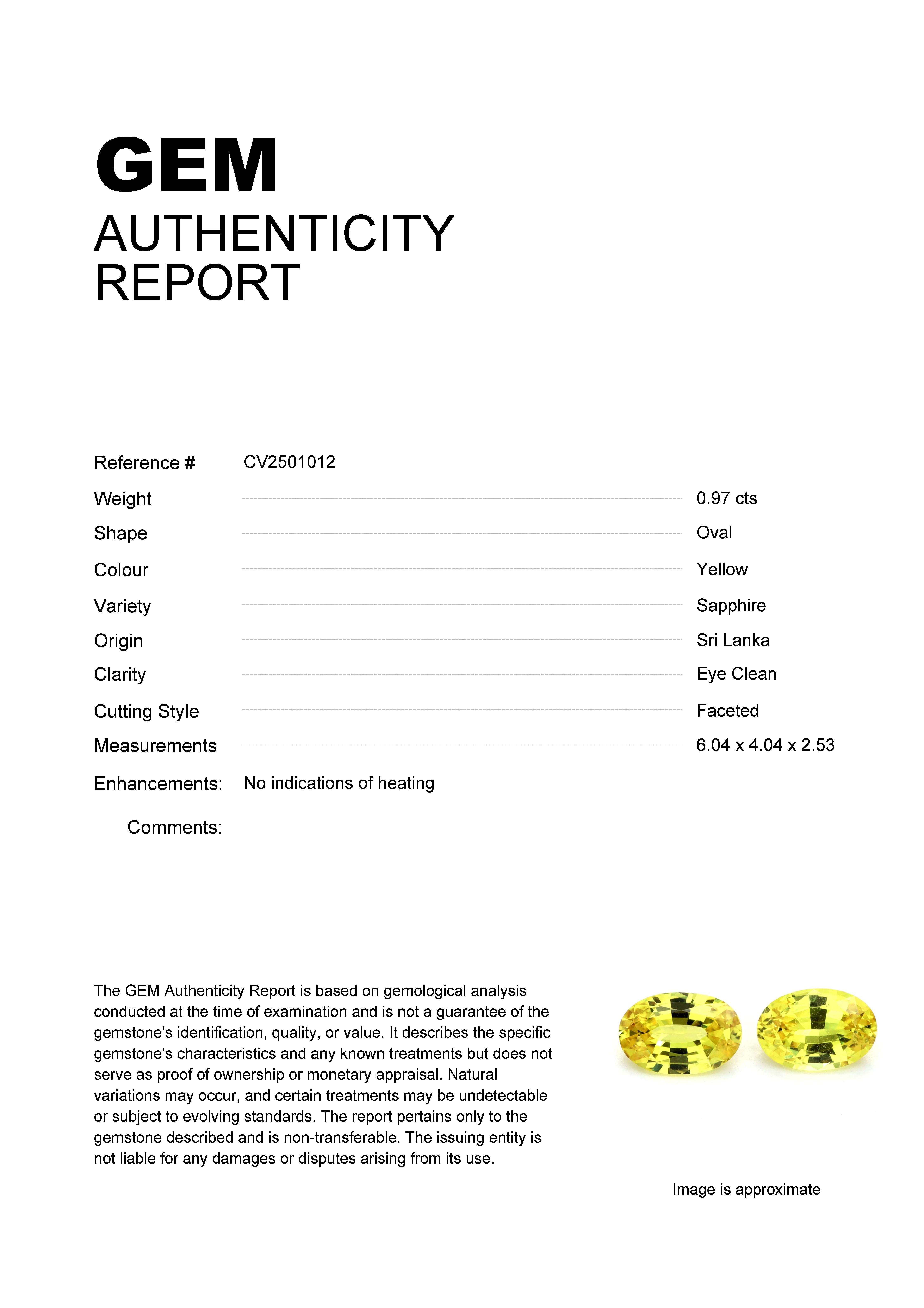0.97ct Yellow Oval Sri Lanka SapphireCarat: 0.97 ctType: SapphireCut: OvalColour: YellowOrigin: Sri LankaComment: Not Heated6.04 x 4.04 x 2.53 mm