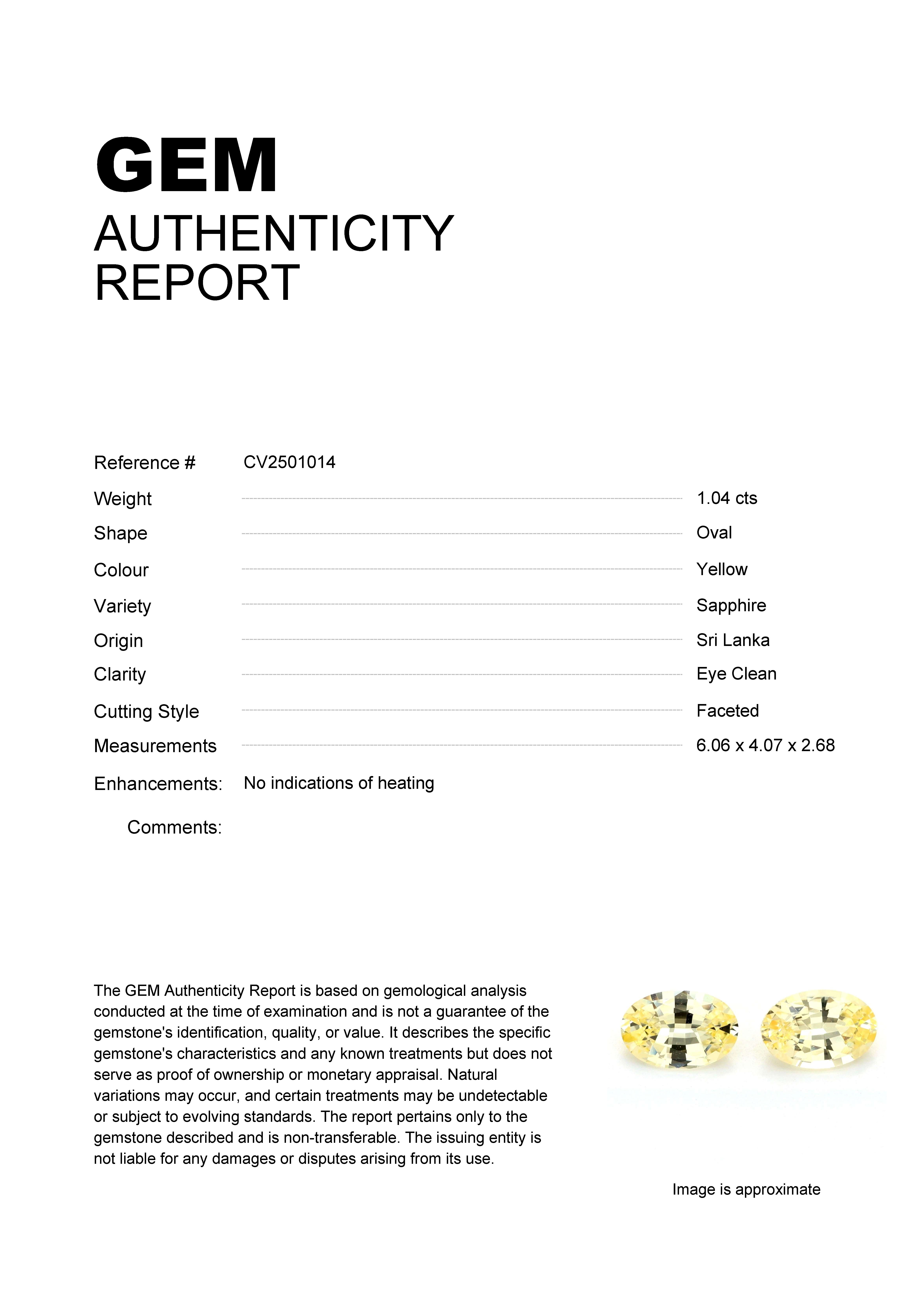 1.04ct Yellow Oval Sri Lanka SapphireCarat: 1.04 ctType: SapphireCut: OvalColour: YellowOrigin: Sri LankaComment: Not Heated6.06 x 4.07 x 2.68 mm