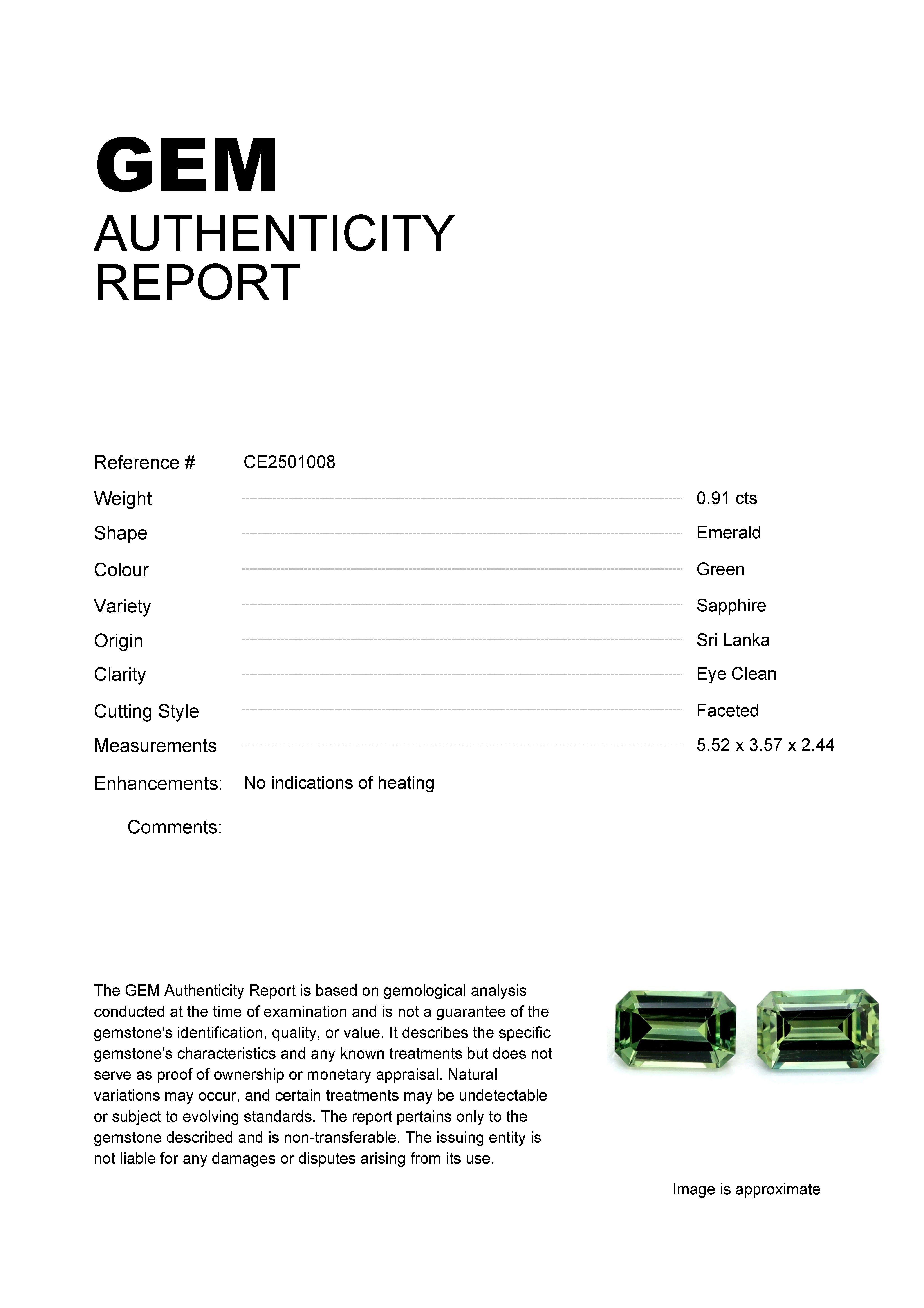 0.91ct Green Emerald Sri Lanka SapphireCarat: 0.91 ctType: SapphireCut: EmeraldColour: GreenOrigin: Sri LankaComment: Not Heated5.52 x 3.57 x 2.44 mm