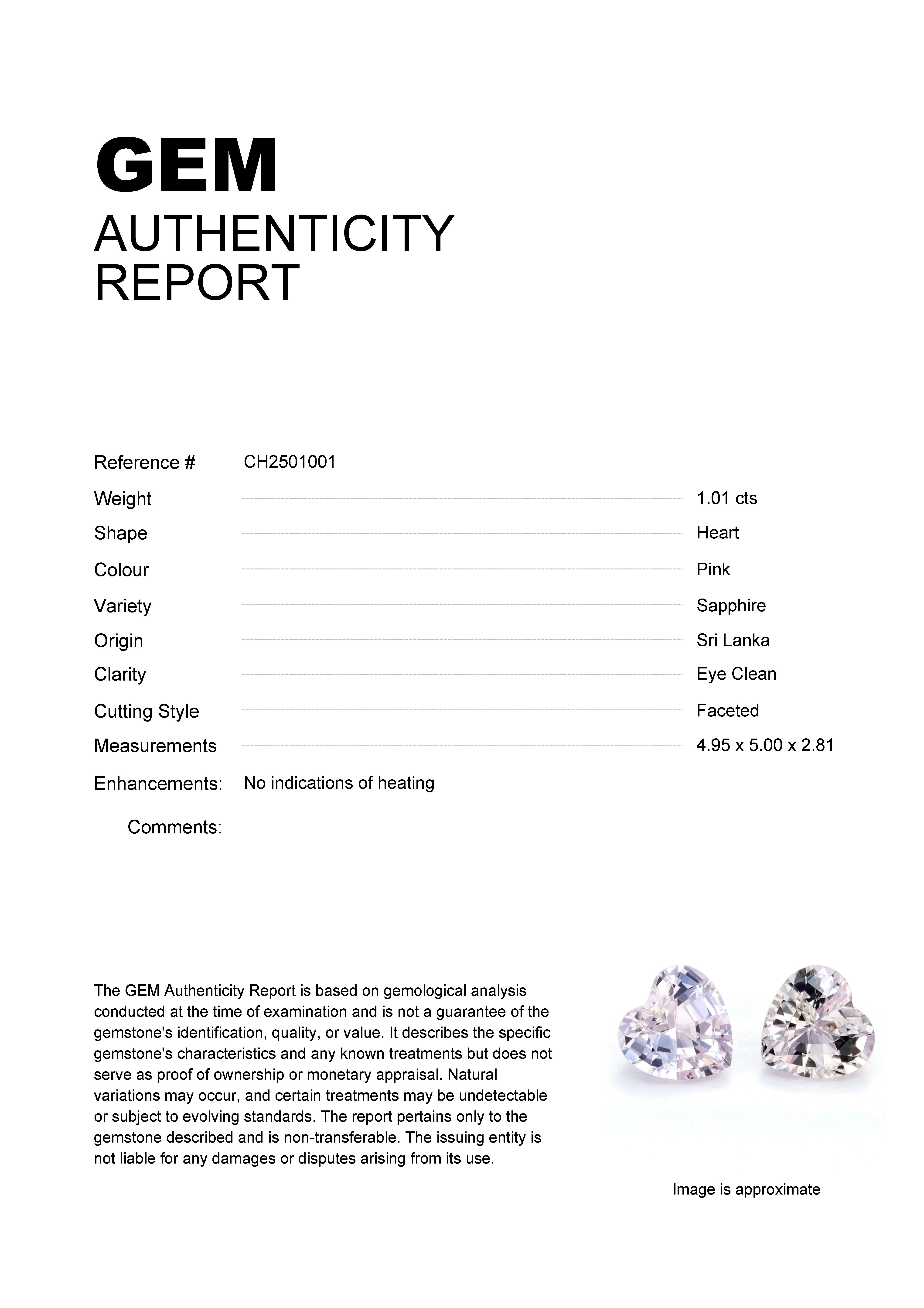 1.01ct Pink Heart Sri Lanka SapphireCarat: 1.01 ctType: SapphireCut: HeartColour: PinkOrigin: Sri LankaComment: Not Heated4.95 x 5.00 x 2.81 mm