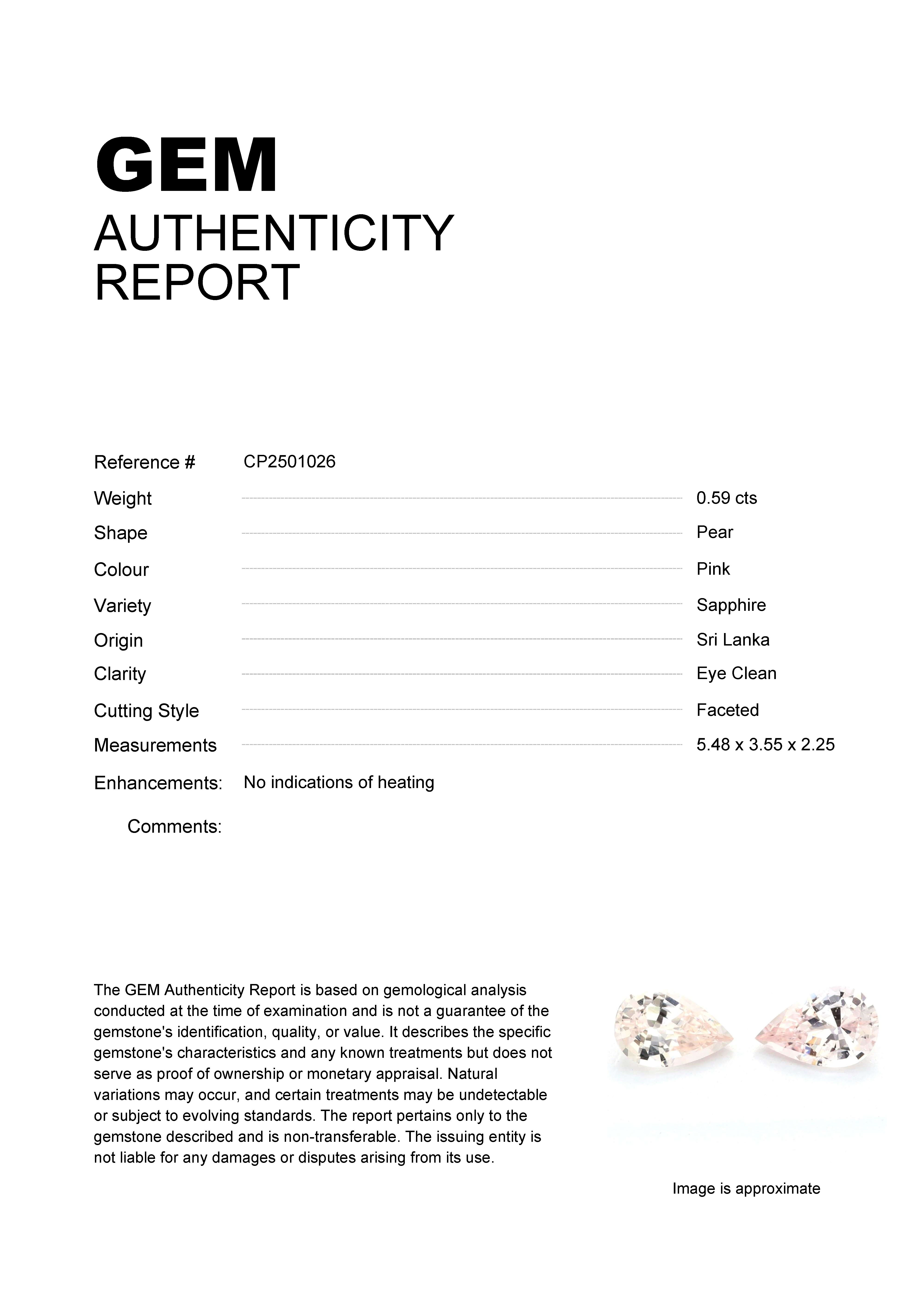 0.59ct Pink Pear Sri Lanka SapphireCarat: 0.59 ctType: SapphireCut: PearColour: PinkOrigin: Sri LankaComment: Not Heated5.48 x 3.55 x 2.25 mm