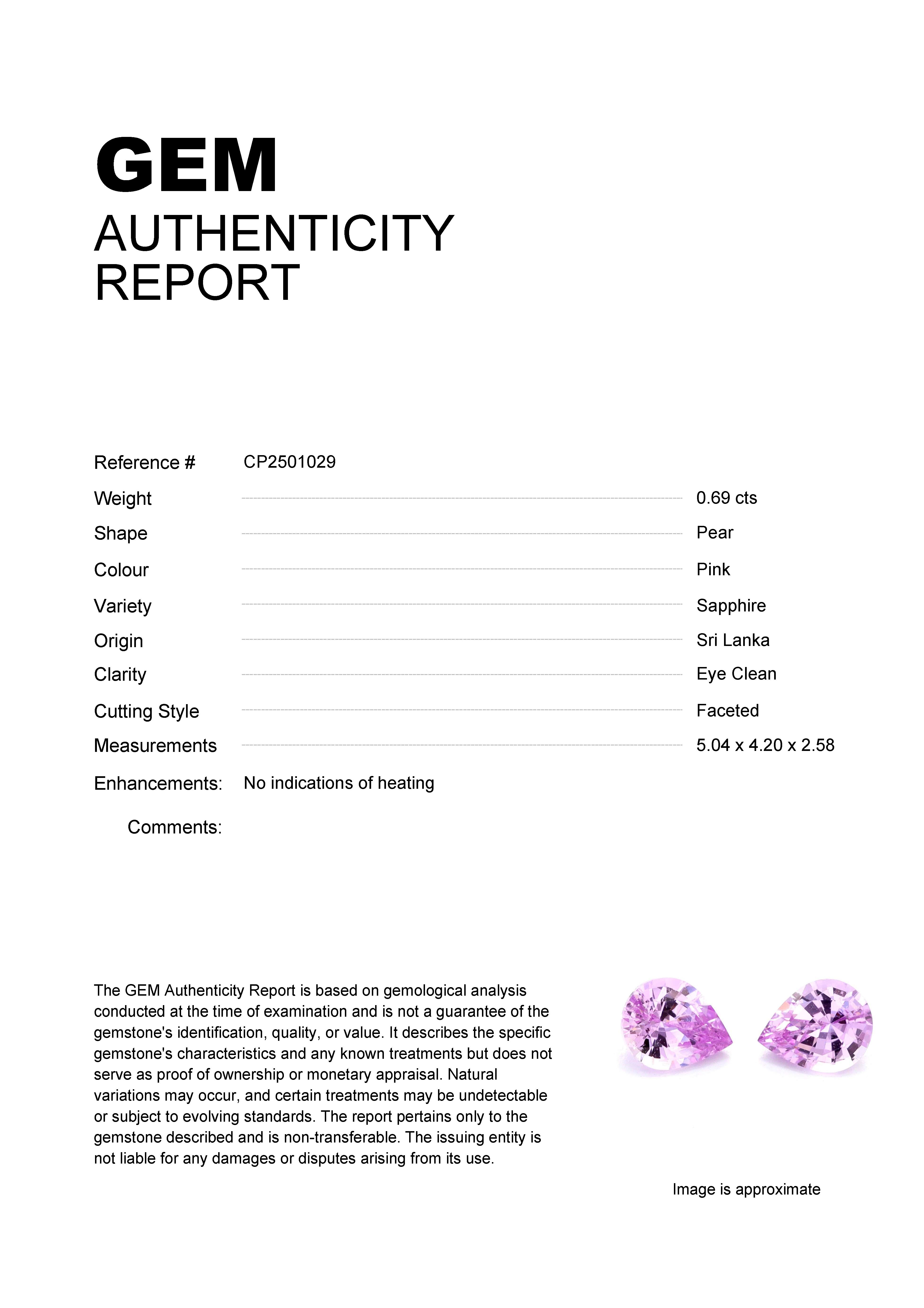 0.69ct Pink Pear Sri Lanka SapphireCarat: 0.69 ctType: SapphireCut: PearColour: PinkOrigin: Sri LankaComment: Not Heated5.04 x 4.20 x 2.58 mm