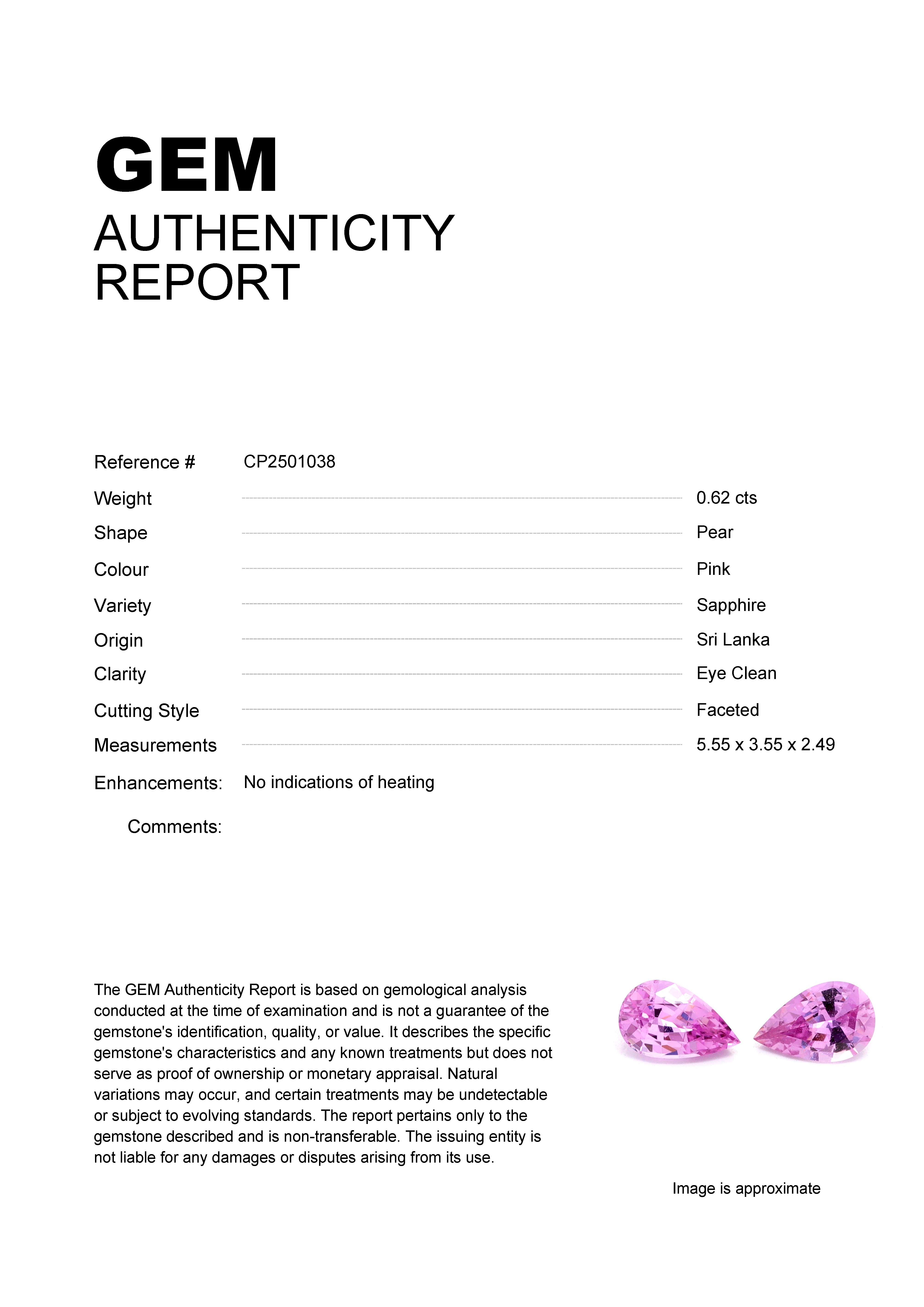 0.62ct Pink Pear Sri Lanka SapphireCarat: 0.62 ctType: SapphireCut: PearColour: PinkOrigin: Sri LankaComment: Not Heated5.55 x 3.55 x 2.49 mm