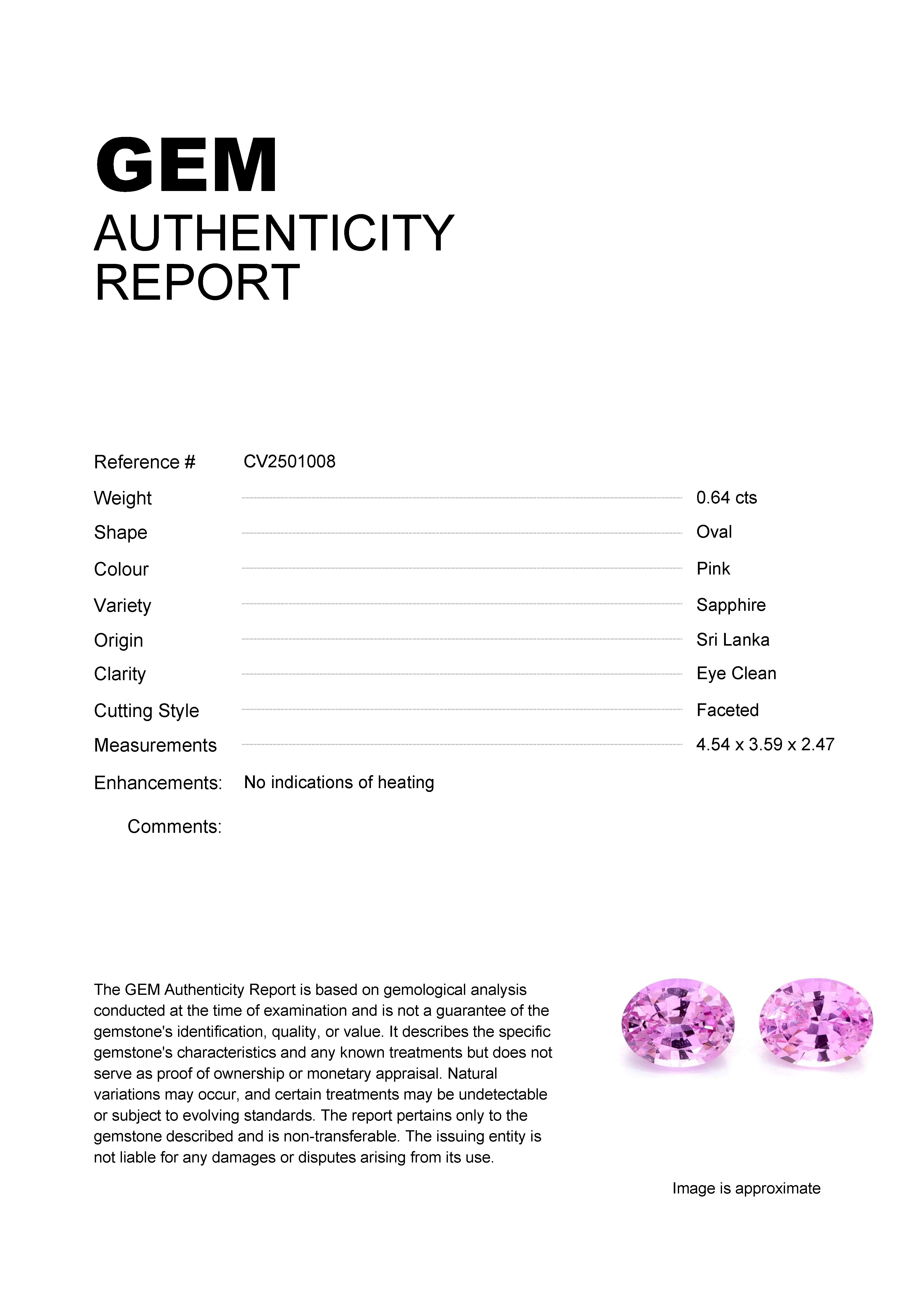 0.64ct Pink Oval Sri Lanka SapphireCarat: 0.64 ctType: SapphireCut: OvalColour: PinkOrigin: Sri LankaComment: Not Heated4.54 x 3.59 x 2.47 mm