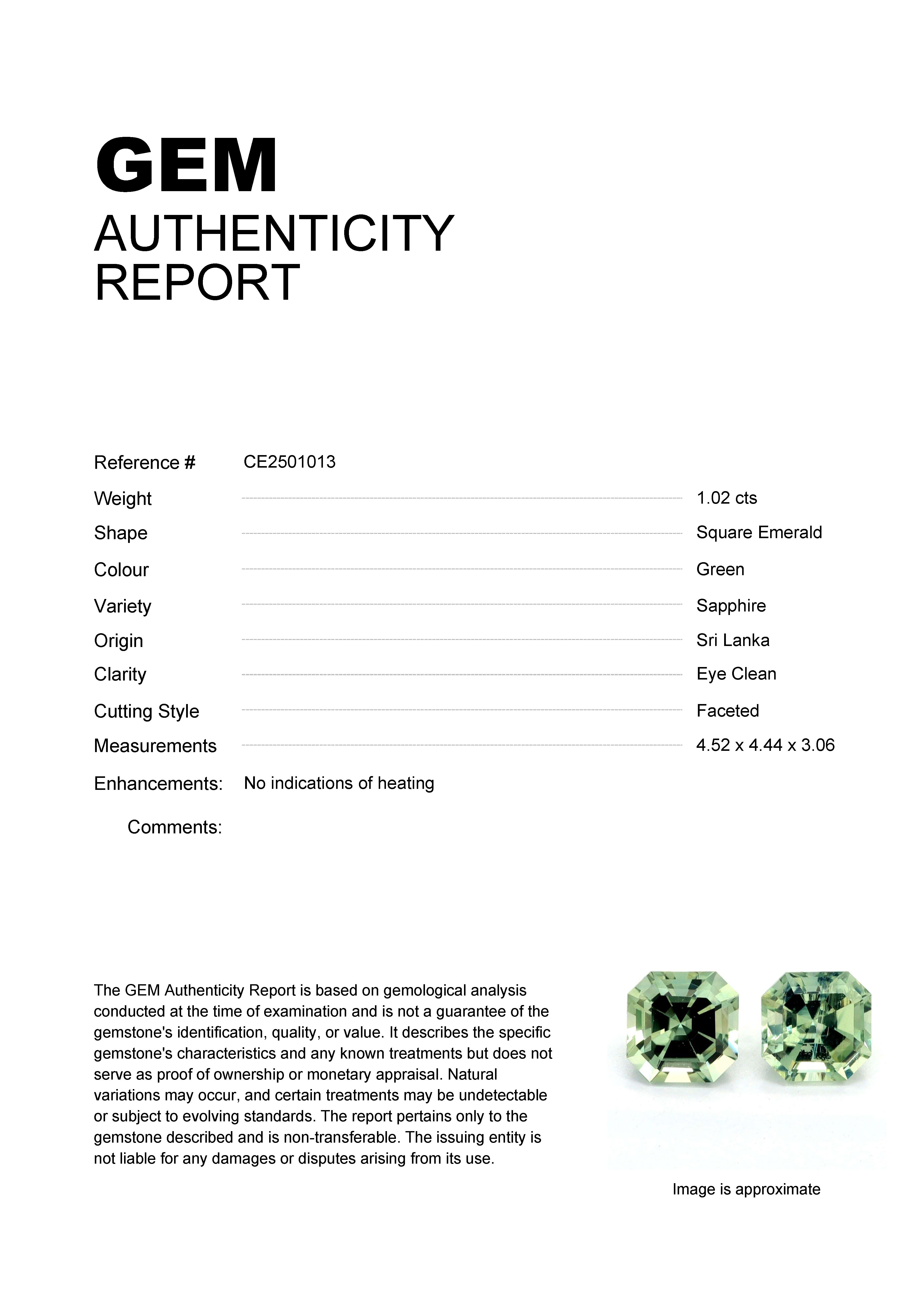 1.02ct Green Square Emerald Sri Lanka SapphireCarat: 1.02 ctType: SapphireCut: Square EmeraldColour: GreenOrigin: Sri LankaComment: Not Heated4.52 x 4.44 x 3.06 mm