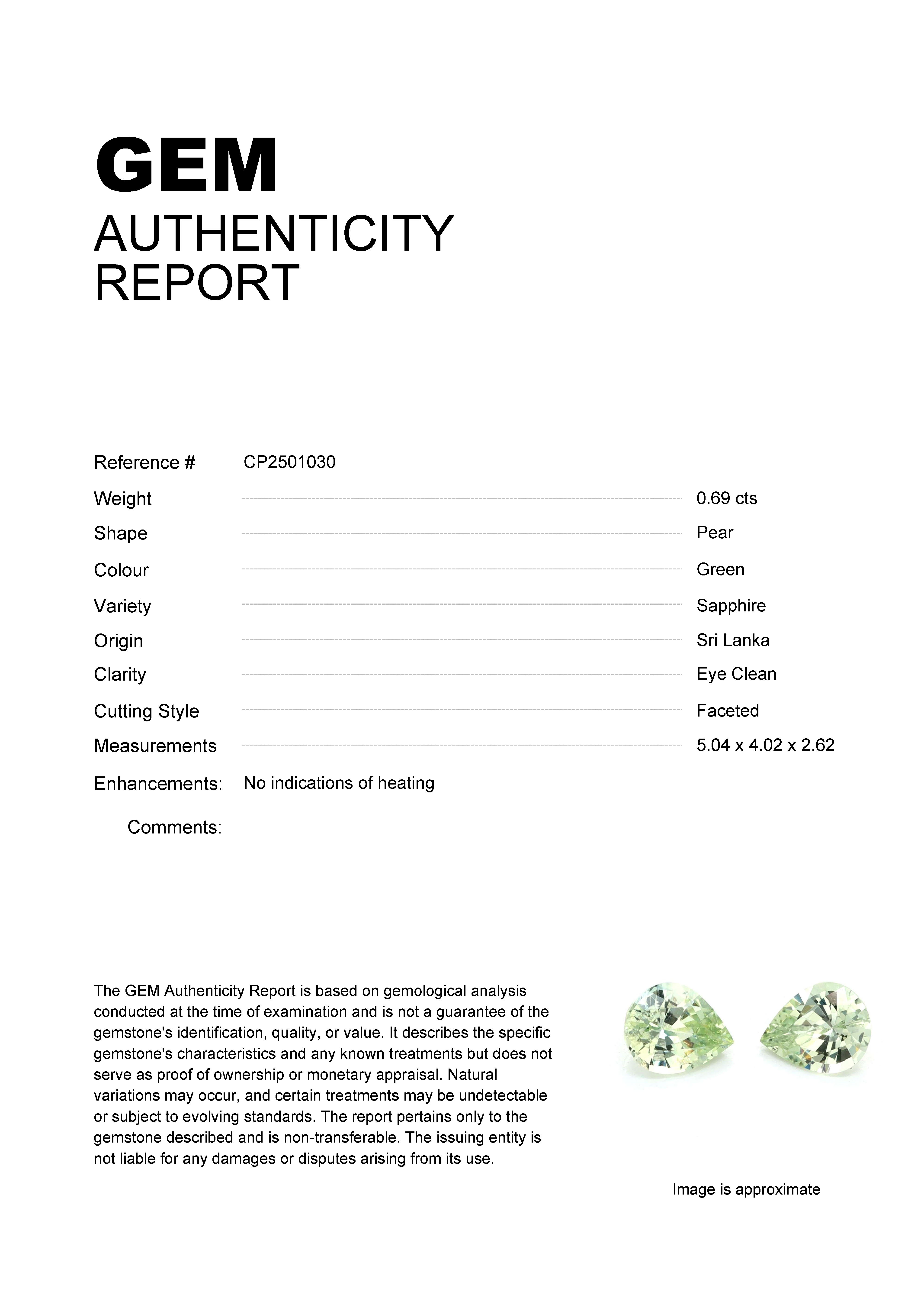 0.69ct Green Pear Sri Lanka SapphireCarat: 0.69 ctType: SapphireCut: PearColour: GreenOrigin: Sri LankaComment: Not Heated5.04 x 4.02 x 2.62 mm