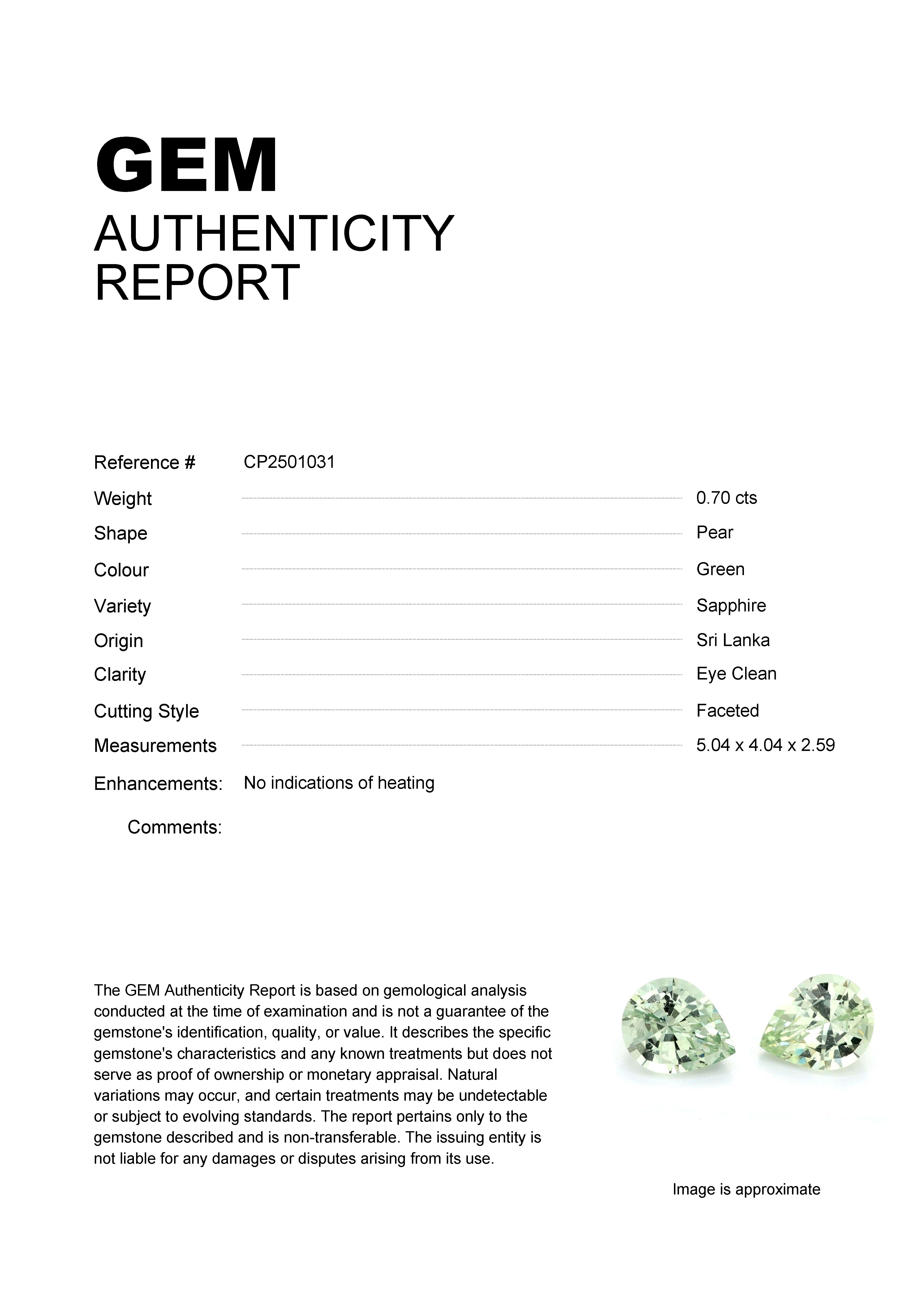 0.70ct Green Pear Sri Lanka SapphireCarat: 0.70 ctType: SapphireCut: PearColour: GreenOrigin: Sri LankaComment: Not Heated5.04 x 4.04 x 2.59 mm