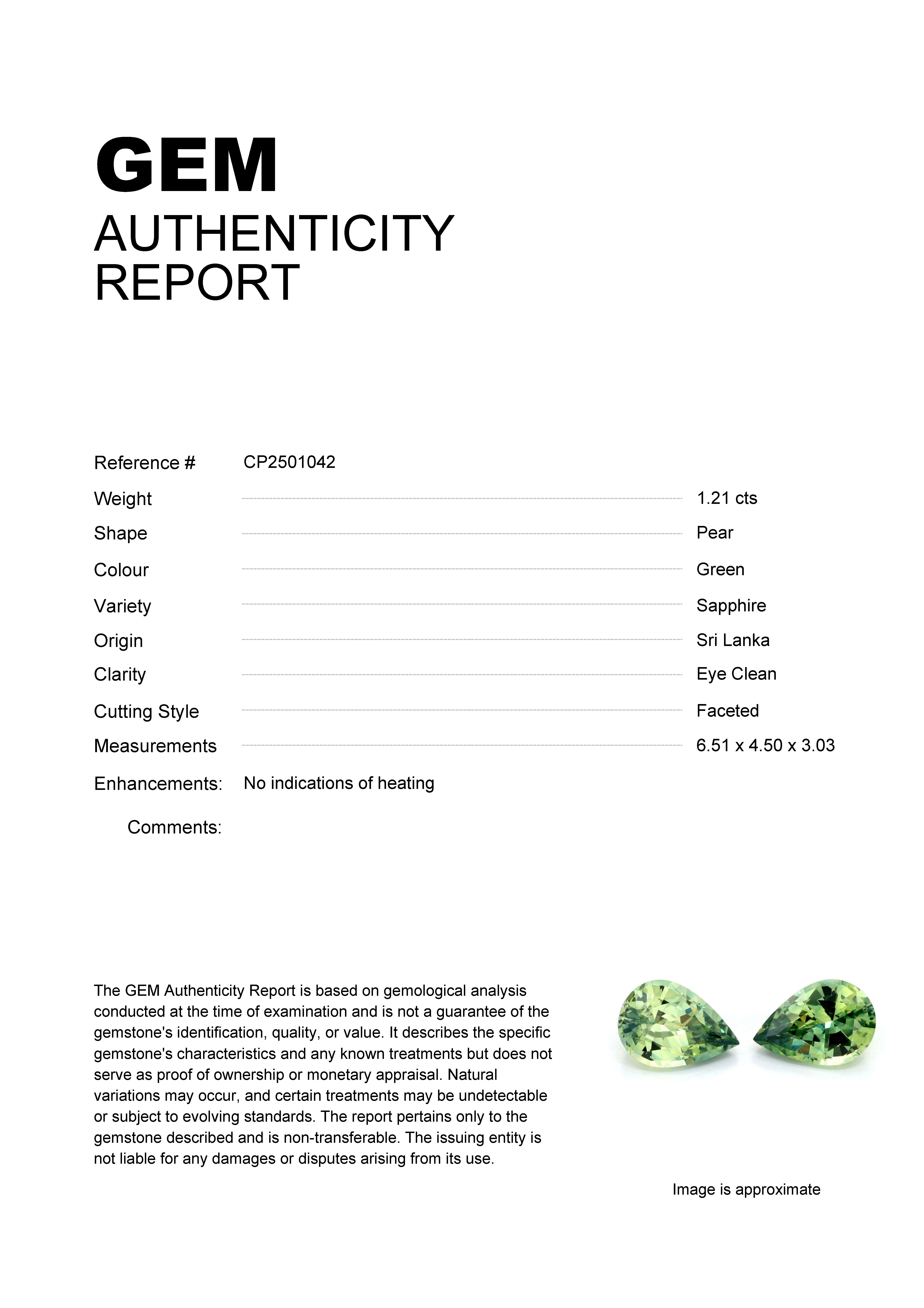 1.21ct Green Pear Sri Lanka SapphireCarat: 1.21 ctType: SapphireCut: PearColour: GreenOrigin: Sri LankaComment: Not Heated6.51 x 4.50 x 3.03 mm