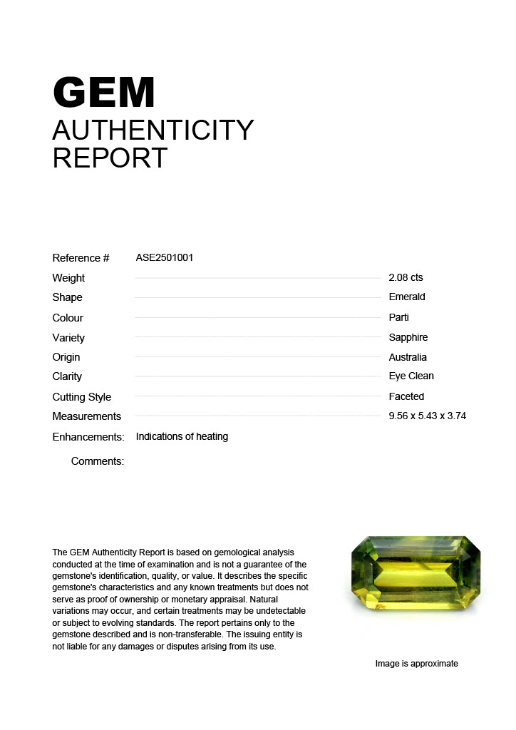 GEM: Stock ID: ASE25010012.08ct Parti Emerald Australia SapphireCarat: 2.08 ctType: SapphireCut: EmeraldColour: PartiOrigin: AustraliaComment: Heated9.56 x 5.43 x 3.74 mm