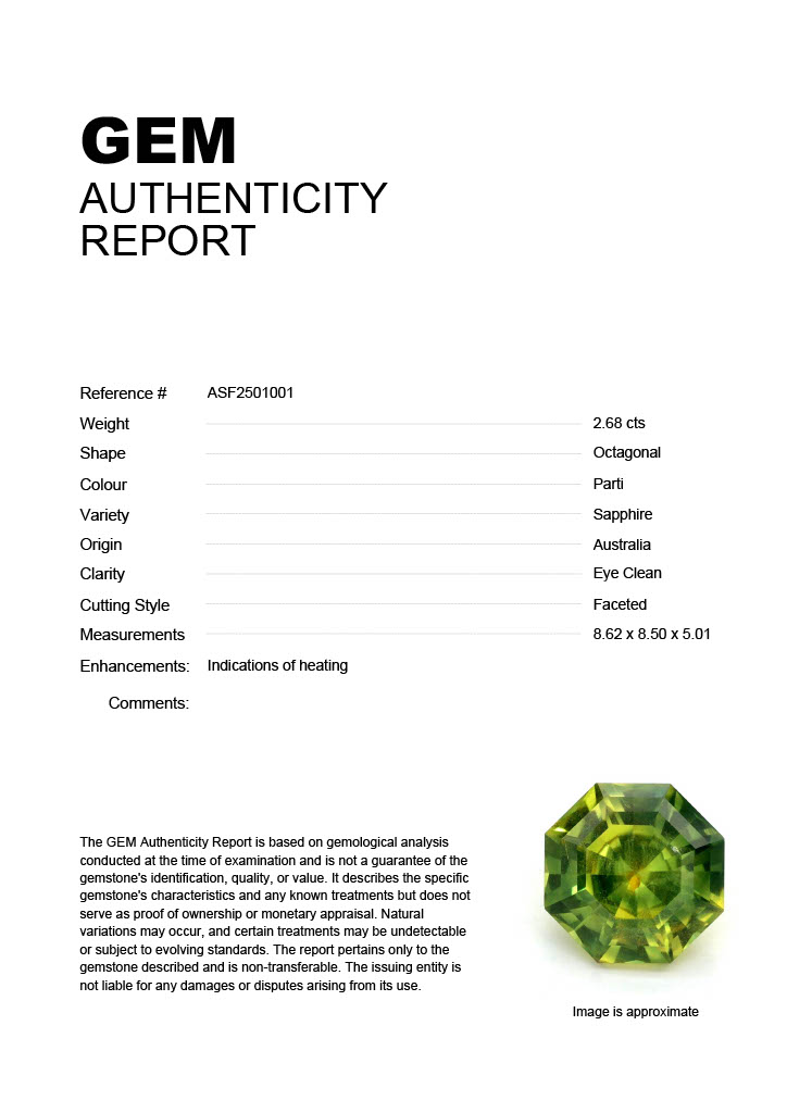 GEM: Stock ID: ASF25010012.68ct Parti Octagonal Australia SapphireCarat: 2.68 ctType: SapphireCut: OctagonalColour: PartiOrigin: AustraliaComment: Heated8.62 x 8.50 x 5.01 mm