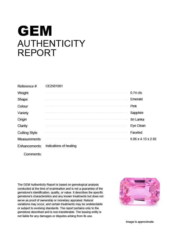 0.74ct Pink Emerald Sri Lanka SapphireCarat: 0.74 ctType: SapphireCut: EmeraldColour: PinkOrigin: Sri LankaComment: Heated6.06 x 4.13 x 2.82 mm