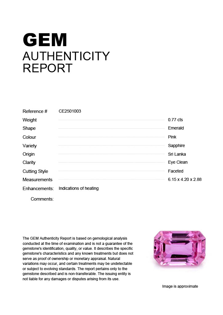 0.77ct Pink Emerald Sri Lanka SapphireCarat: 0.77 ctType: SapphireCut: EmeraldColour: PinkOrigin: Sri LankaComment: Heated6.15 x 4.20 x 2.88 mm
