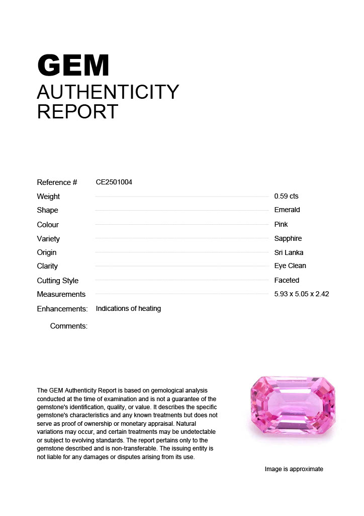 0.59ct Pink Emerald Sri Lanka SapphireCarat: 0.59 ctType: SapphireCut: EmeraldColour: PinkOrigin: Sri LankaComment: Heated5.93 x 5.05 x 2.42 mm