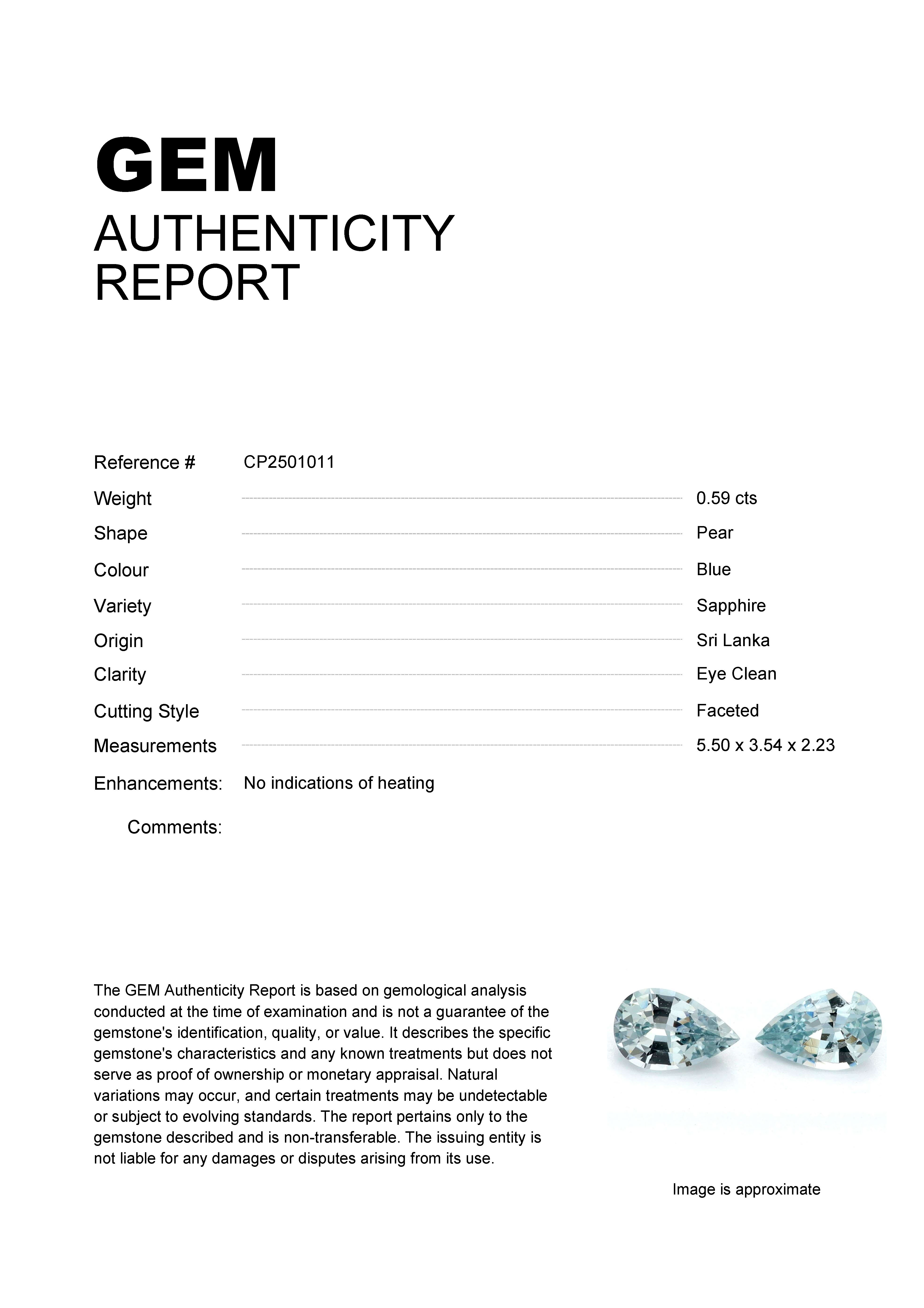 0.59ct Blue Pear Sri Lanka SapphireCarat: 0.59 ctType: SapphireCut: PearColour: BlueOrigin: Sri LankaComment: Not Heated5.50 x 3.54 x 2.23 mm
