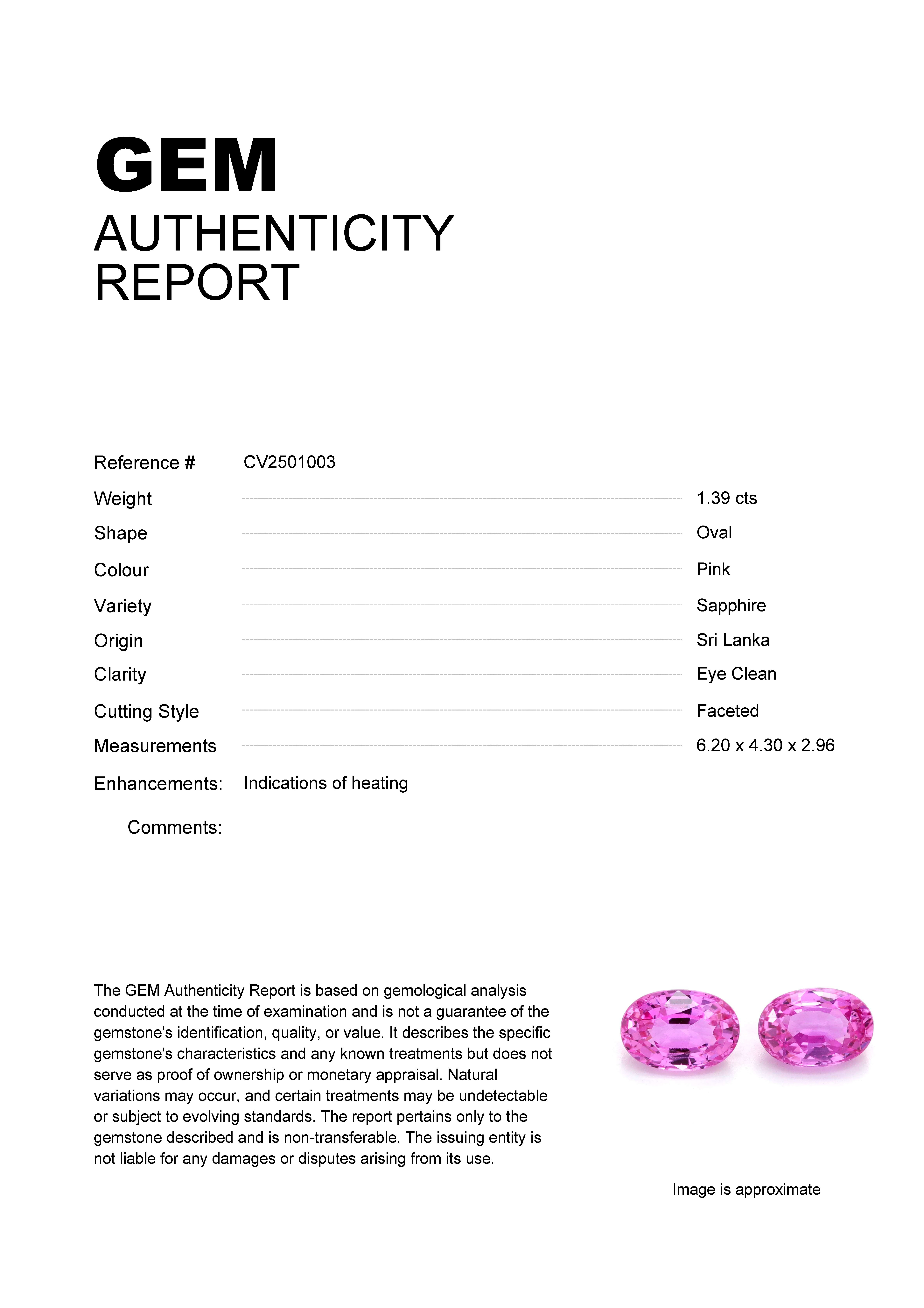 1.39ct Pink Oval Sri Lanka SapphireCarat: 1.39 ctType: SapphireCut: OvalColour: PinkOrigin: Sri LankaComment: Heated6.20 x 4.30 x 2.96 mm