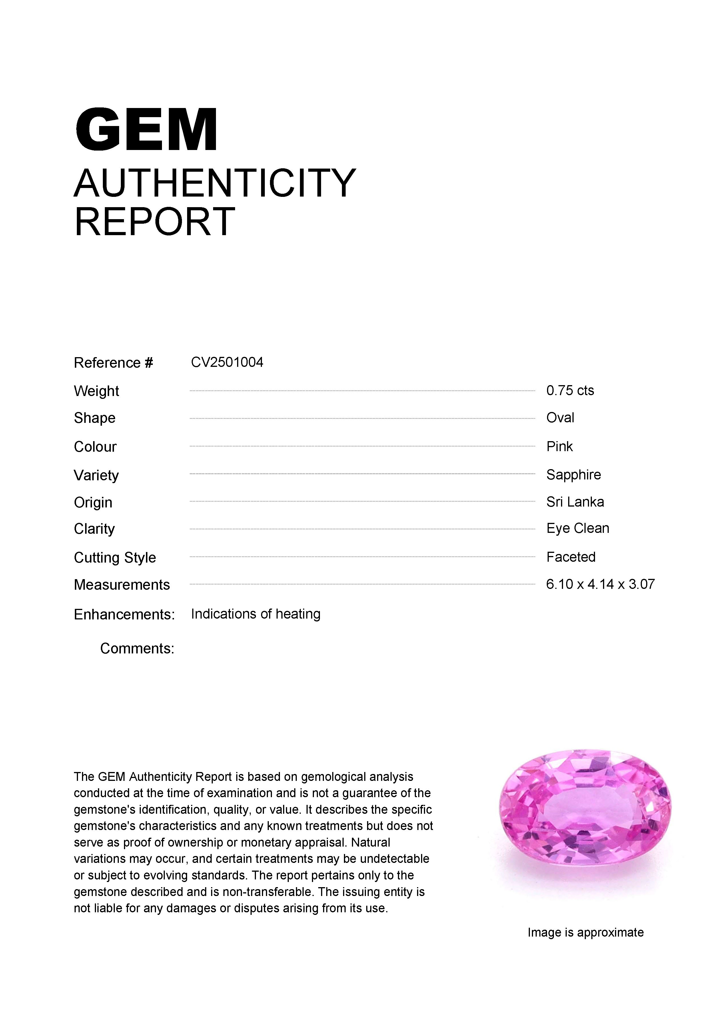 0.75ct Pink Oval Sri Lanka SapphireCarat: 0.75 ctType: SapphireCut: OvalColour: PinkOrigin: Sri LankaComment: Heated6.10 x 4.14 x 3.07 mm