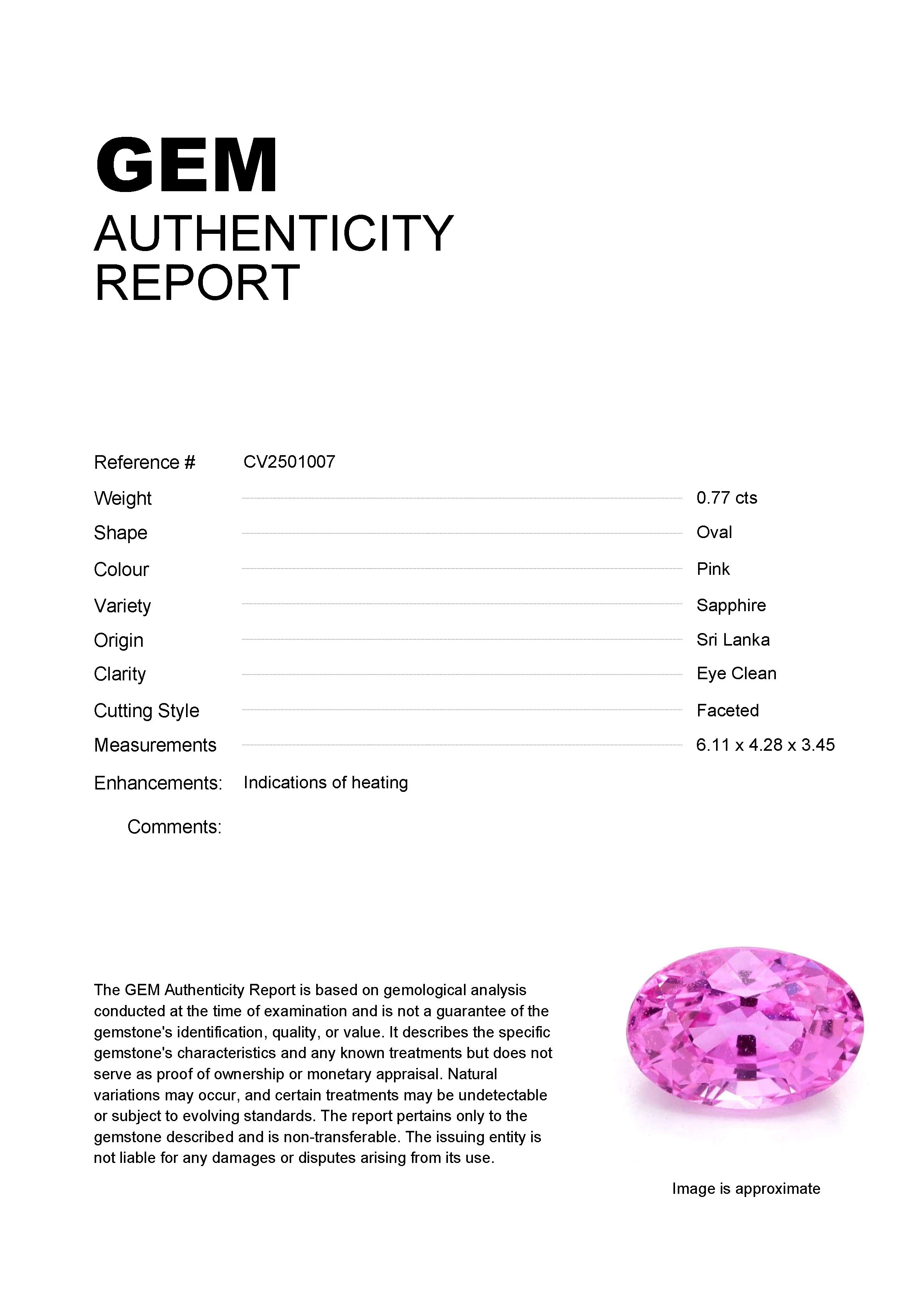 0.77ct Pink Oval Sri Lanka SapphireCarat: 0.77 ctType: SapphireCut: OvalColour: PinkOrigin: Sri LankaComment: Heated6.11 x 4.28 x 3.45 mm