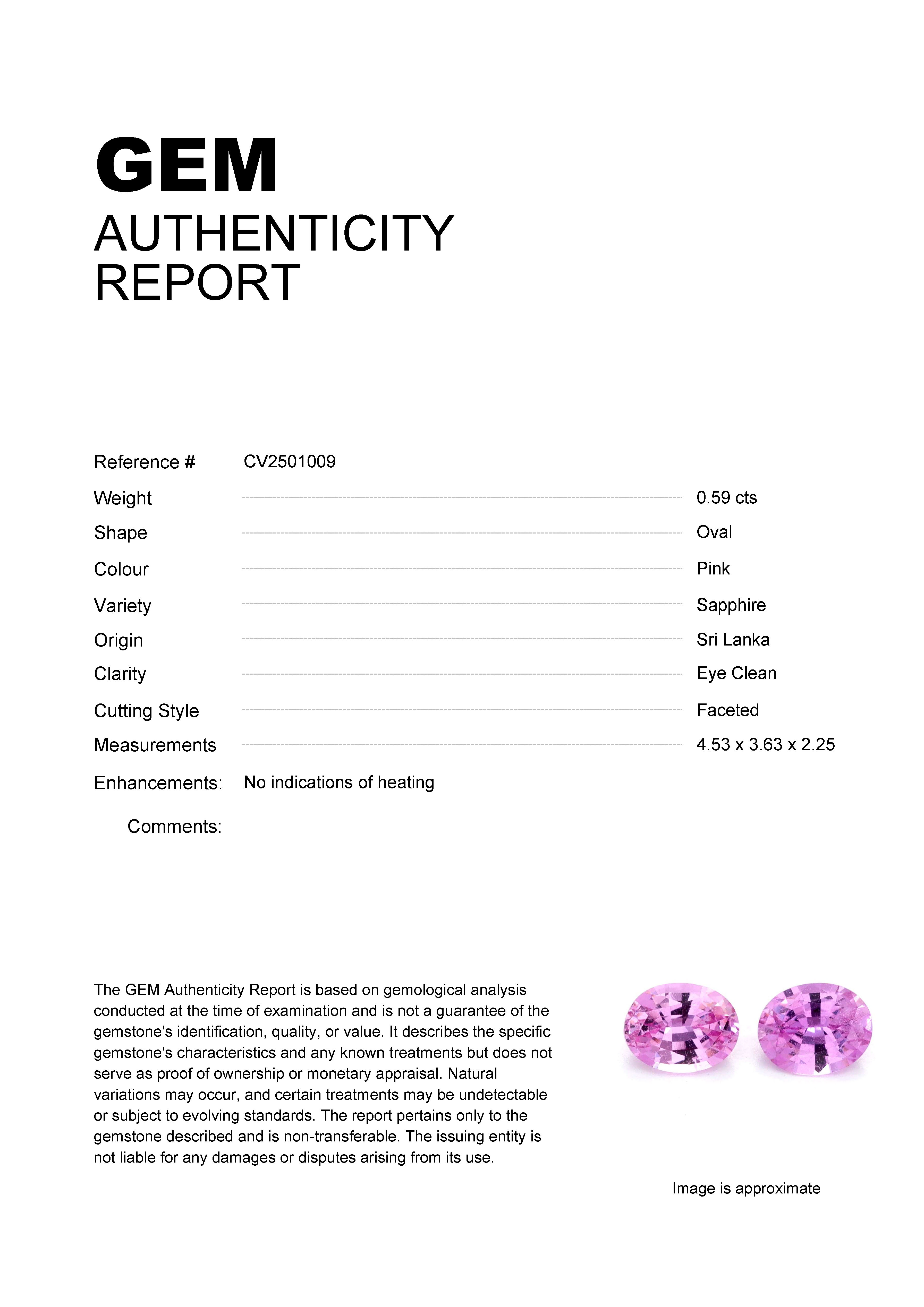 0.59ct Pink Oval Sri Lanka SapphireCarat: 0.59 ctType: SapphireCut: OvalColour: PinkOrigin: Sri LankaComment: Not Heated4.53 x 3.63 x 2.25 mm