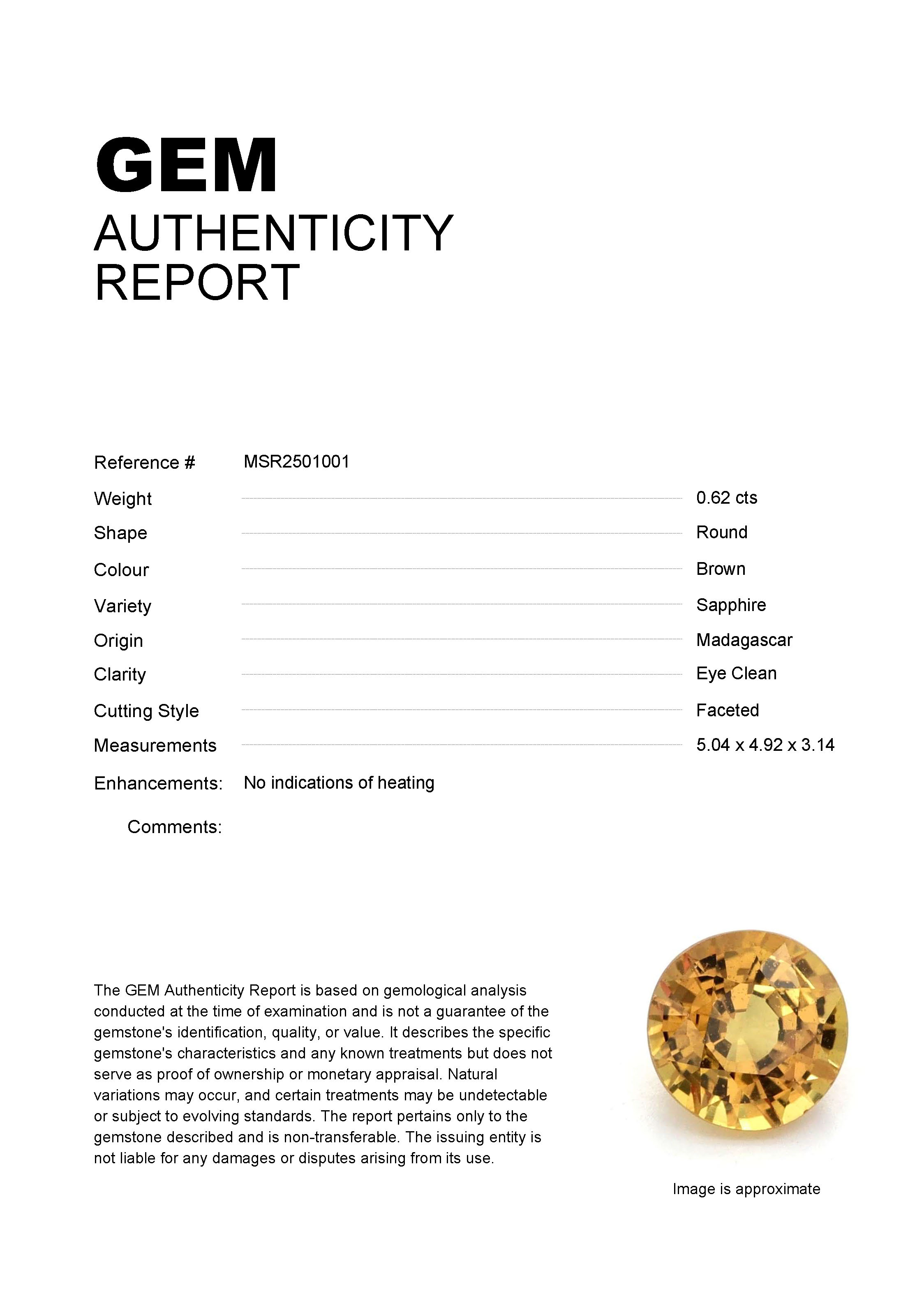 GEM: MSR2501001 Stock ID: MSR25010010.62ct Brown Round Madagascar SapphireCarat: 0.62 ctType: SapphireCut: RoundColour: BrownOrigin: MadagascarComment: Not Heated5.04 x 4.92 x 3.14 mm