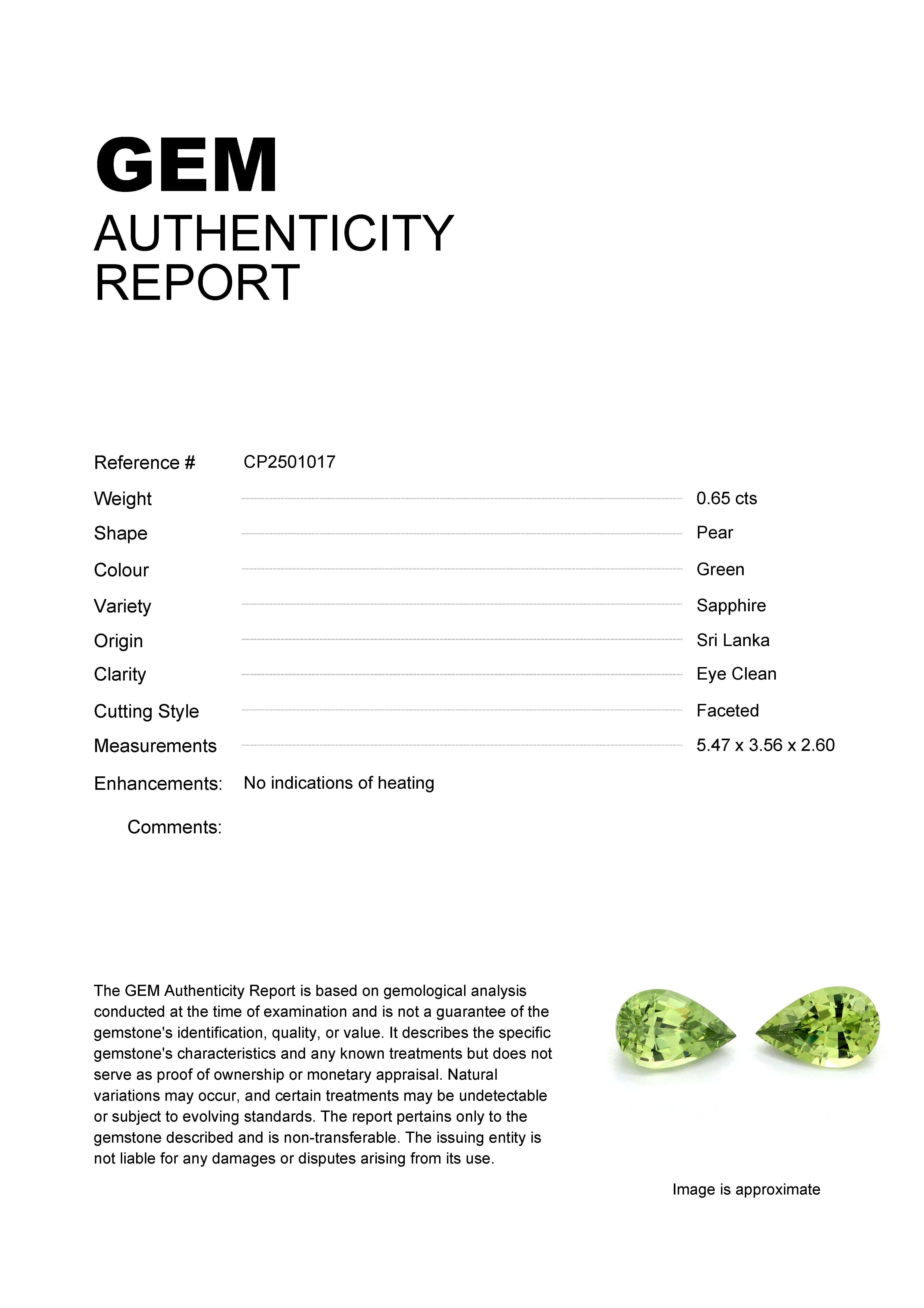 0.65ct Green Pear Sri Lanka SapphireCarat: 0.65 ctType: SapphireCut: PearColour: GreenOrigin: Sri LankaComment: Not Heated5.47 x 3.56 x 2.60 mm