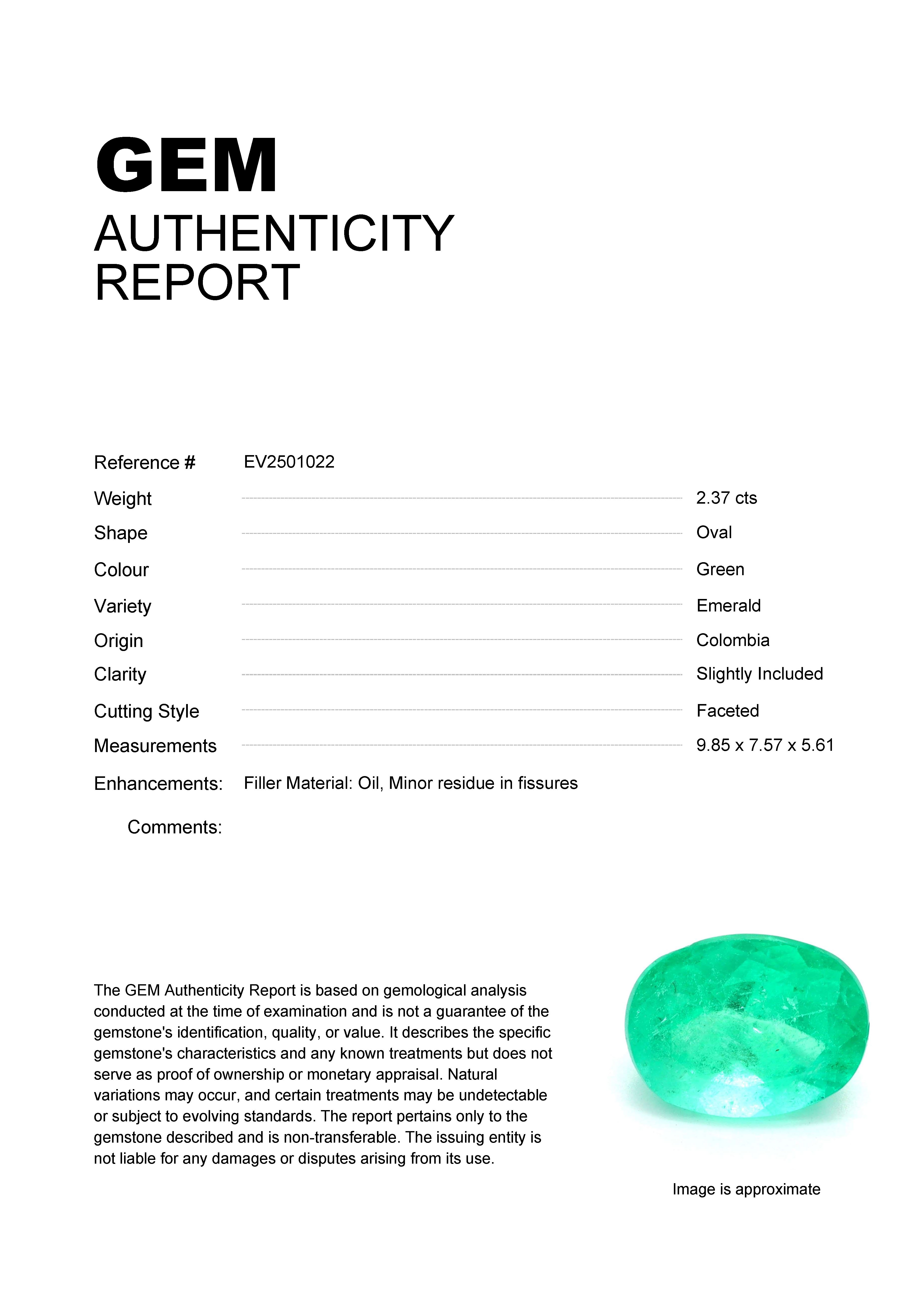 2.37ct Green Oval Colombia EmeraldCarat: 2.37 ctType: EmeraldCut: OvalColour: GreenOrigin: ColombiaComment: Not Heated,
