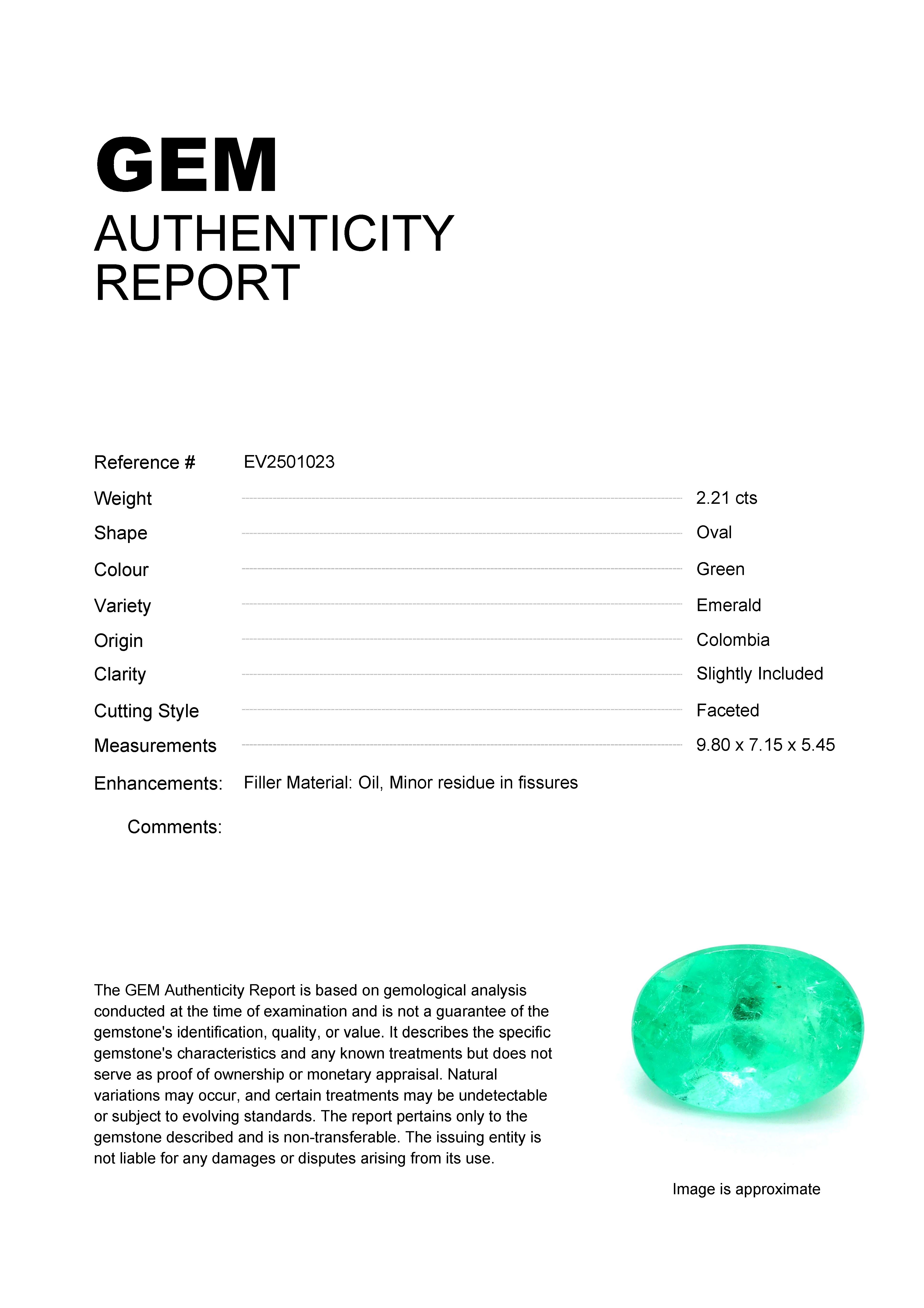 2.21ct Green Oval Colombia EmeraldCarat: 2.21 ctType: EmeraldCut: OvalColour: GreenOrigin: ColombiaComment: Not Heated,