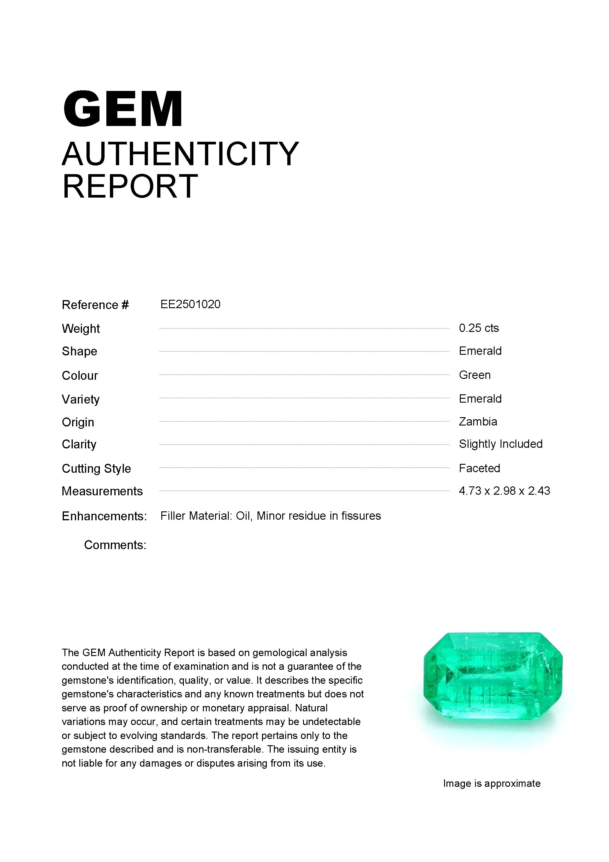 0.25ct Green Emerald Zambia EmeraldCarat: 0.25 ctType: EmeraldCut: EmeraldColour: GreenOrigin: ZambiaComment: Not Heated,