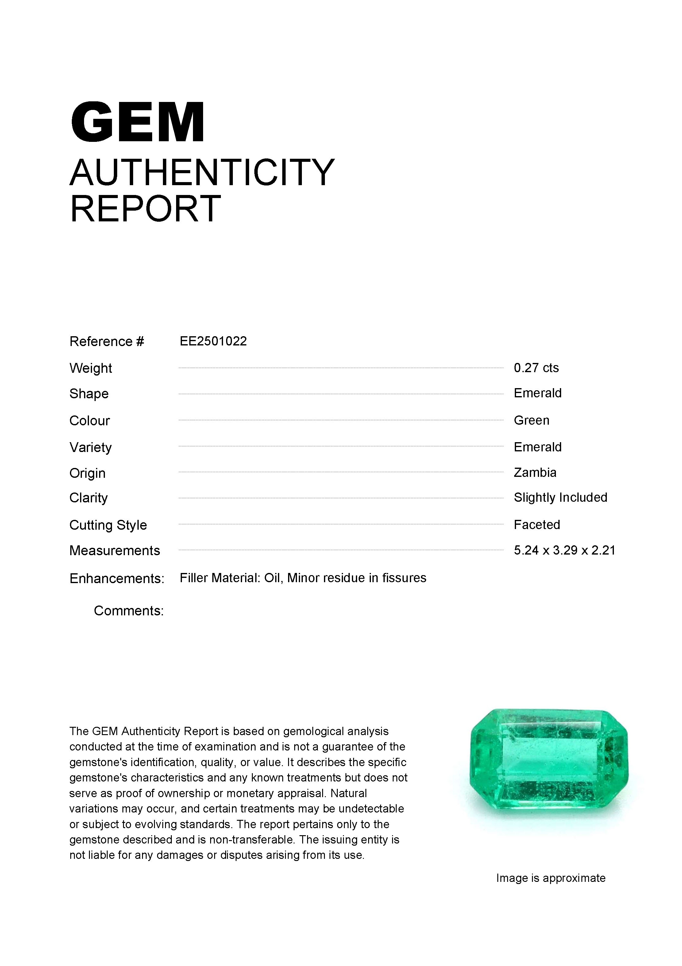 0.27ct Green Emerald Zambia EmeraldCarat: 0.27 ctType: EmeraldCut: EmeraldColour: GreenOrigin: ZambiaComment: Not Heated,