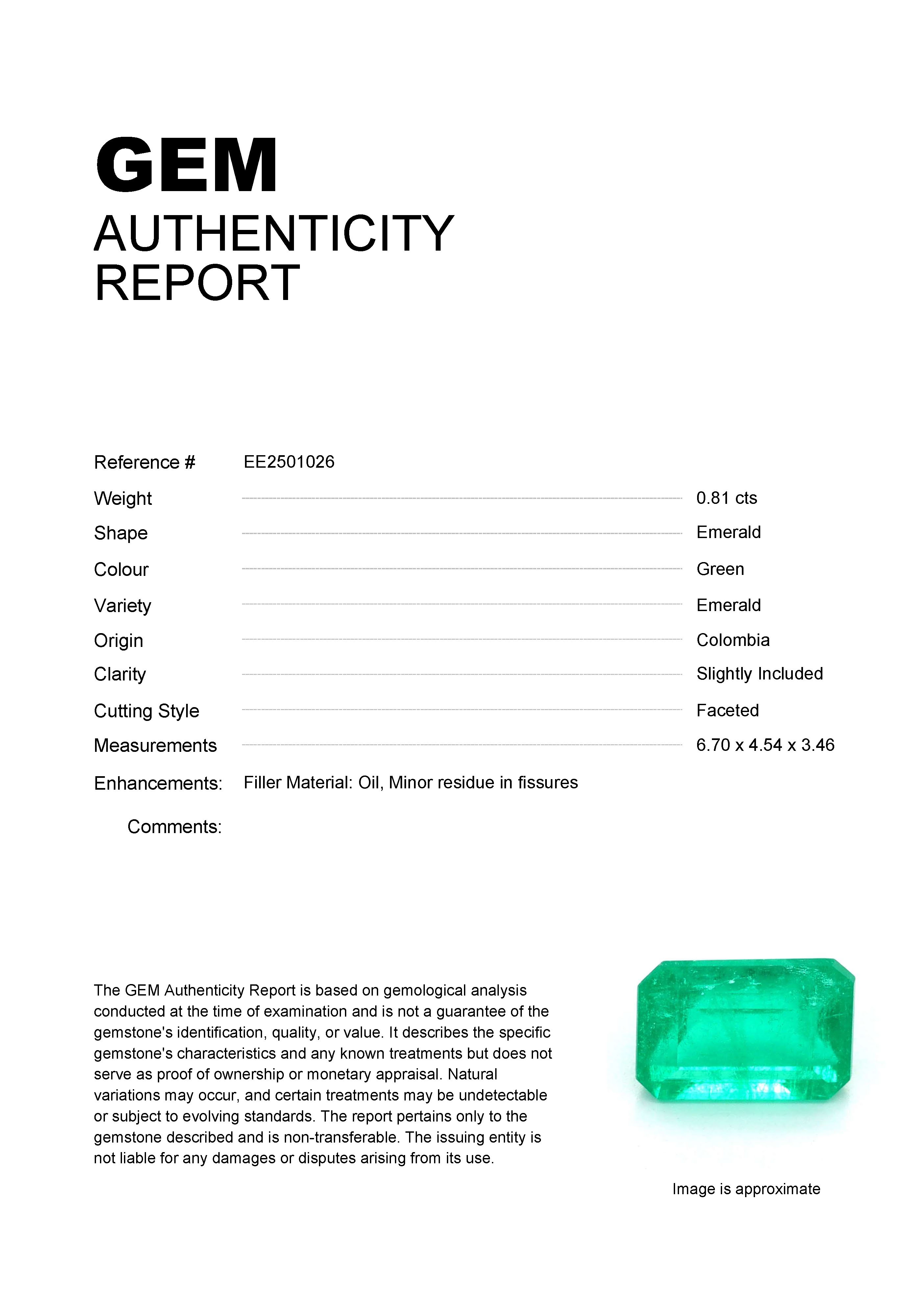 0.81ct Green Emerald Colombia EmeraldCarat: 0.81 ctType: EmeraldCut: EmeraldColour: GreenOrigin: ColombiaComment: Not Heated,